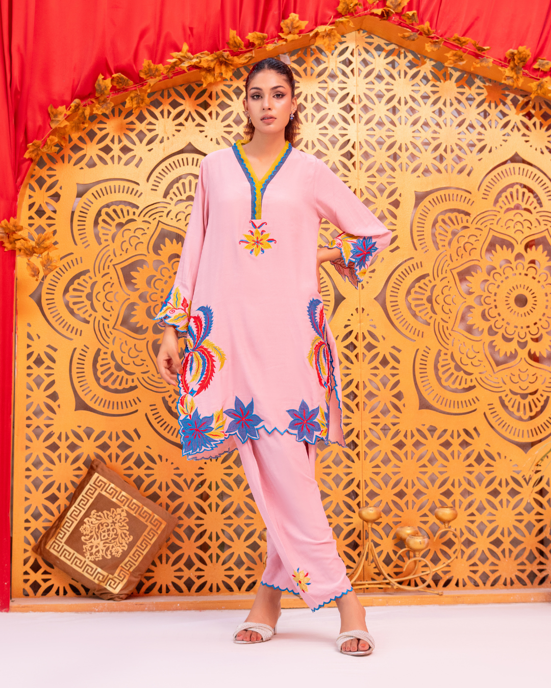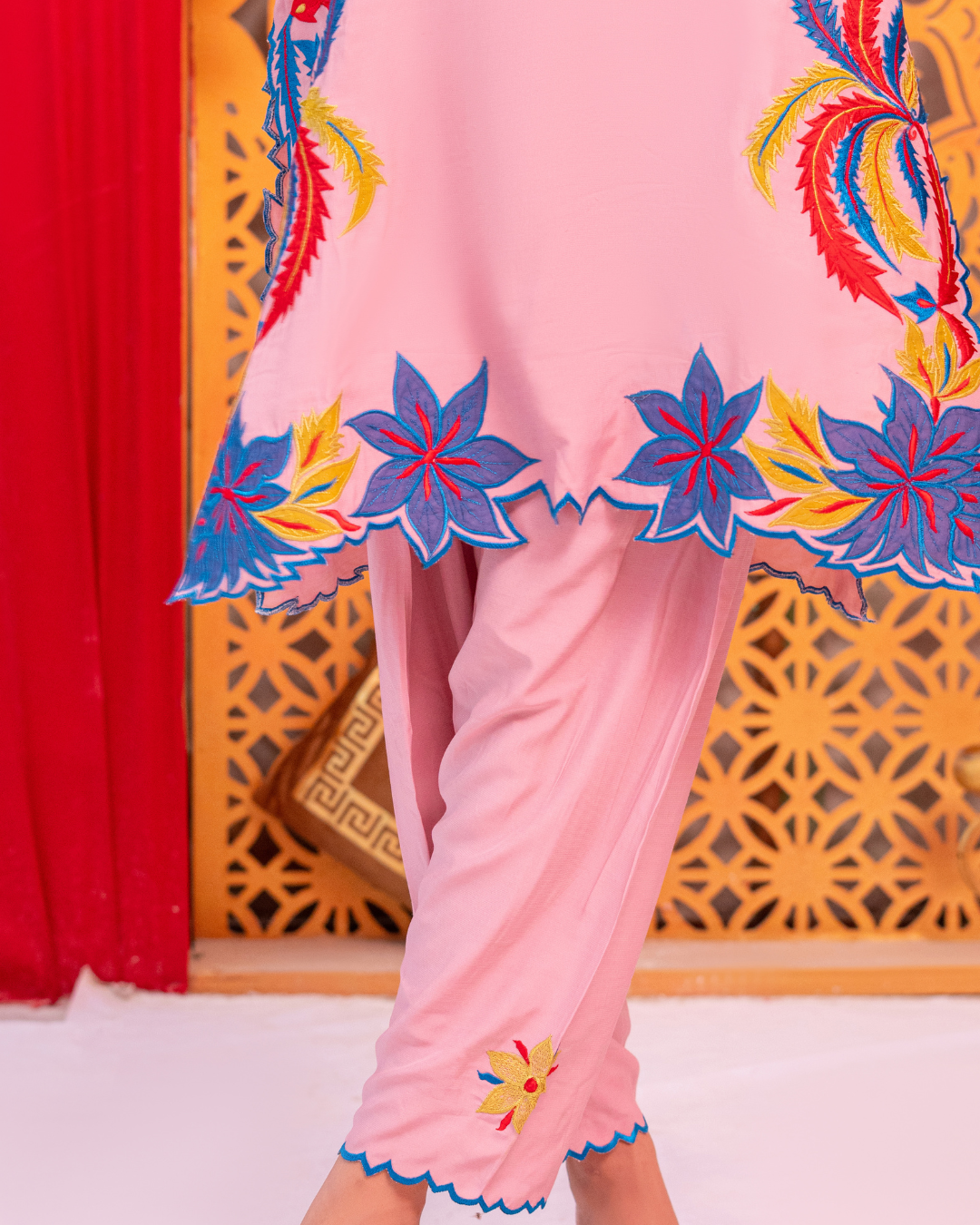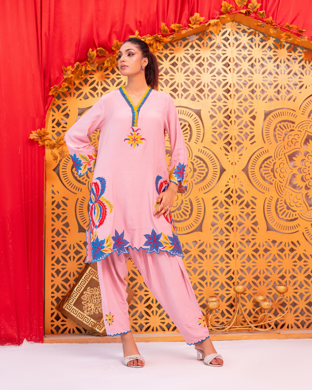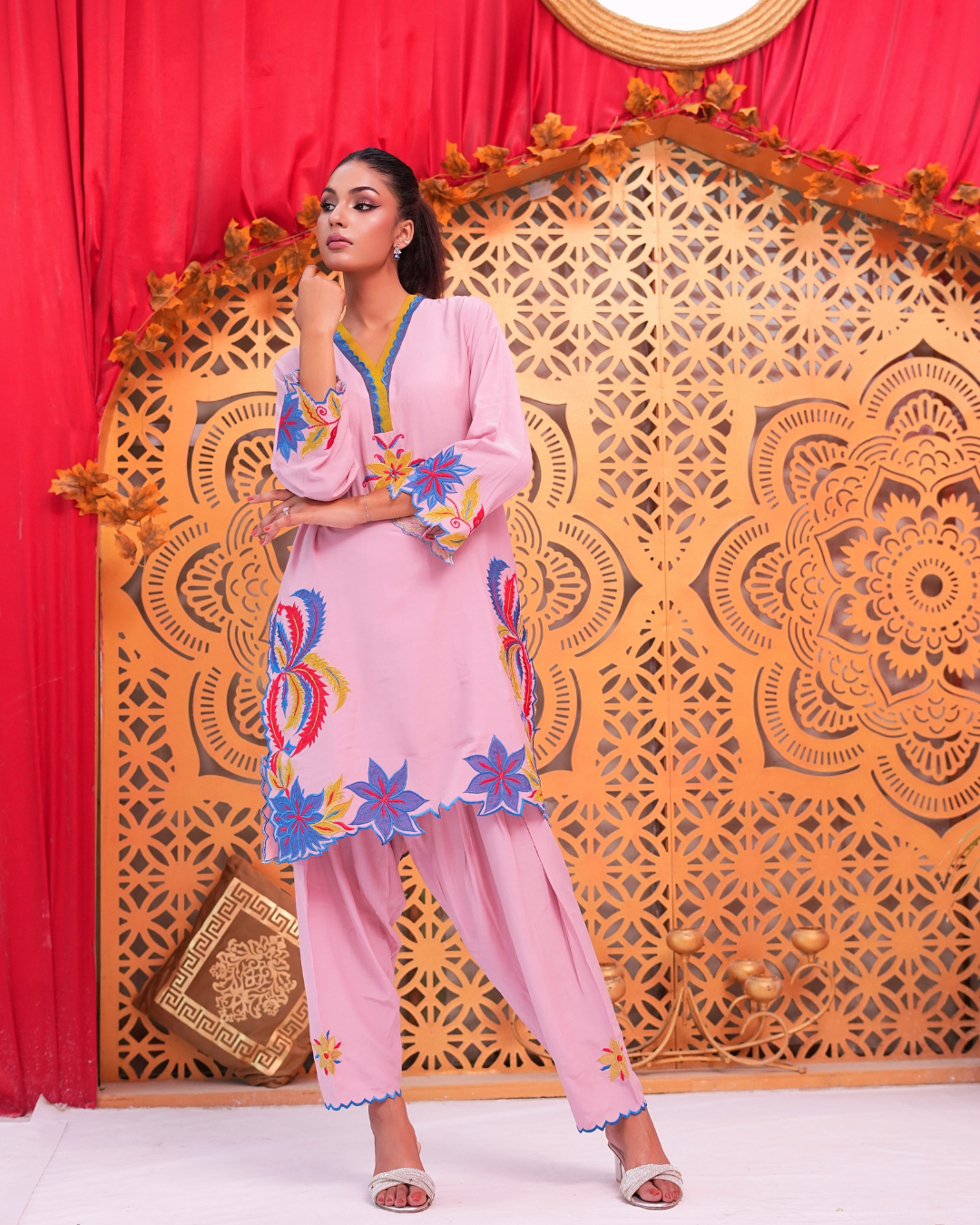 a beautifully designed two-piece ready-to-wear outfit crafted from soft viscose silk. The tea pink base is enhanced with intricate machine embroidery and delicate appliqué work in teal blue, neon, and deep red tones. Featuring a short-cut shirt paired with a matching shalwar, Arisha blends modern style with effortless comfort.