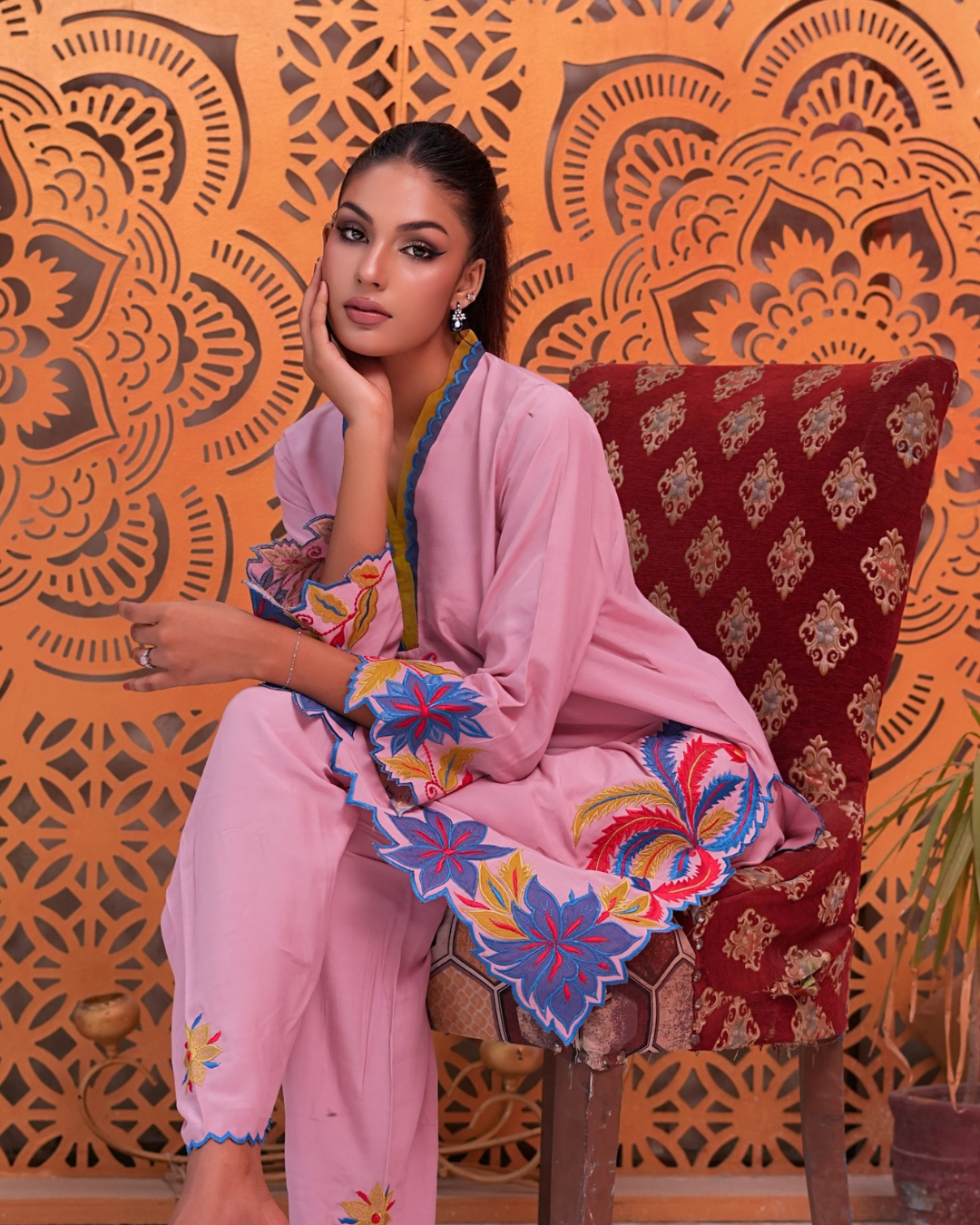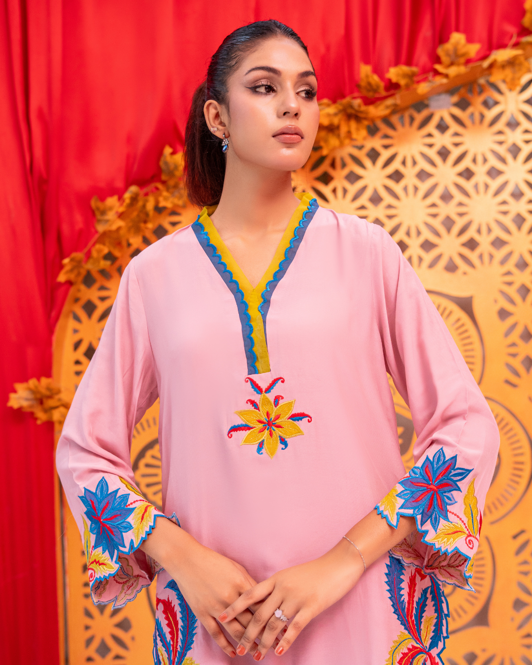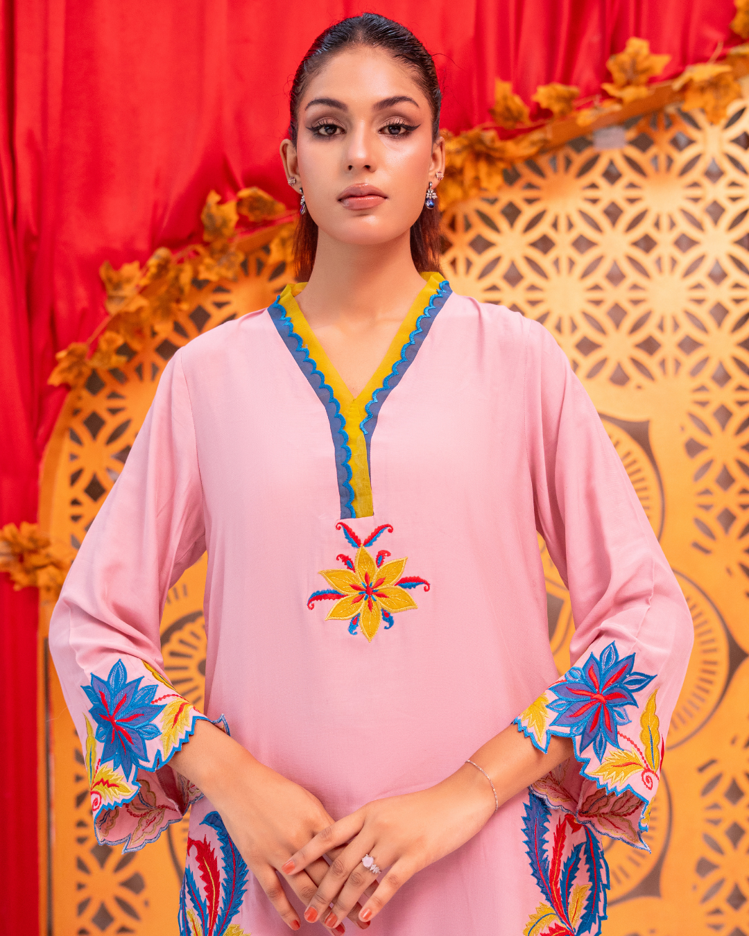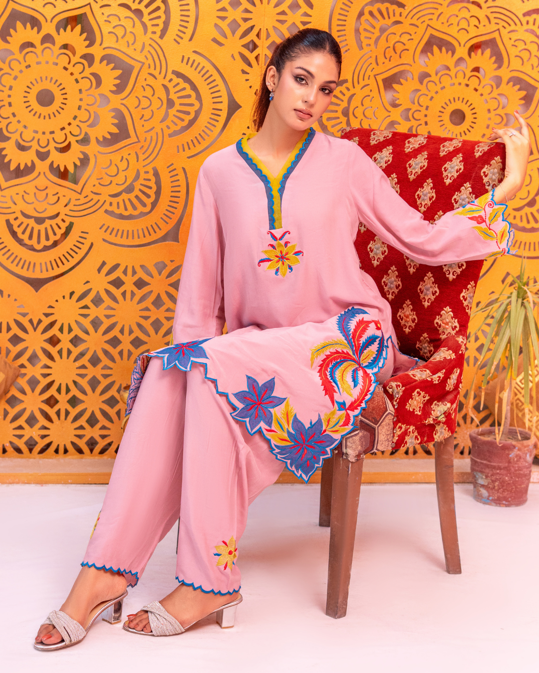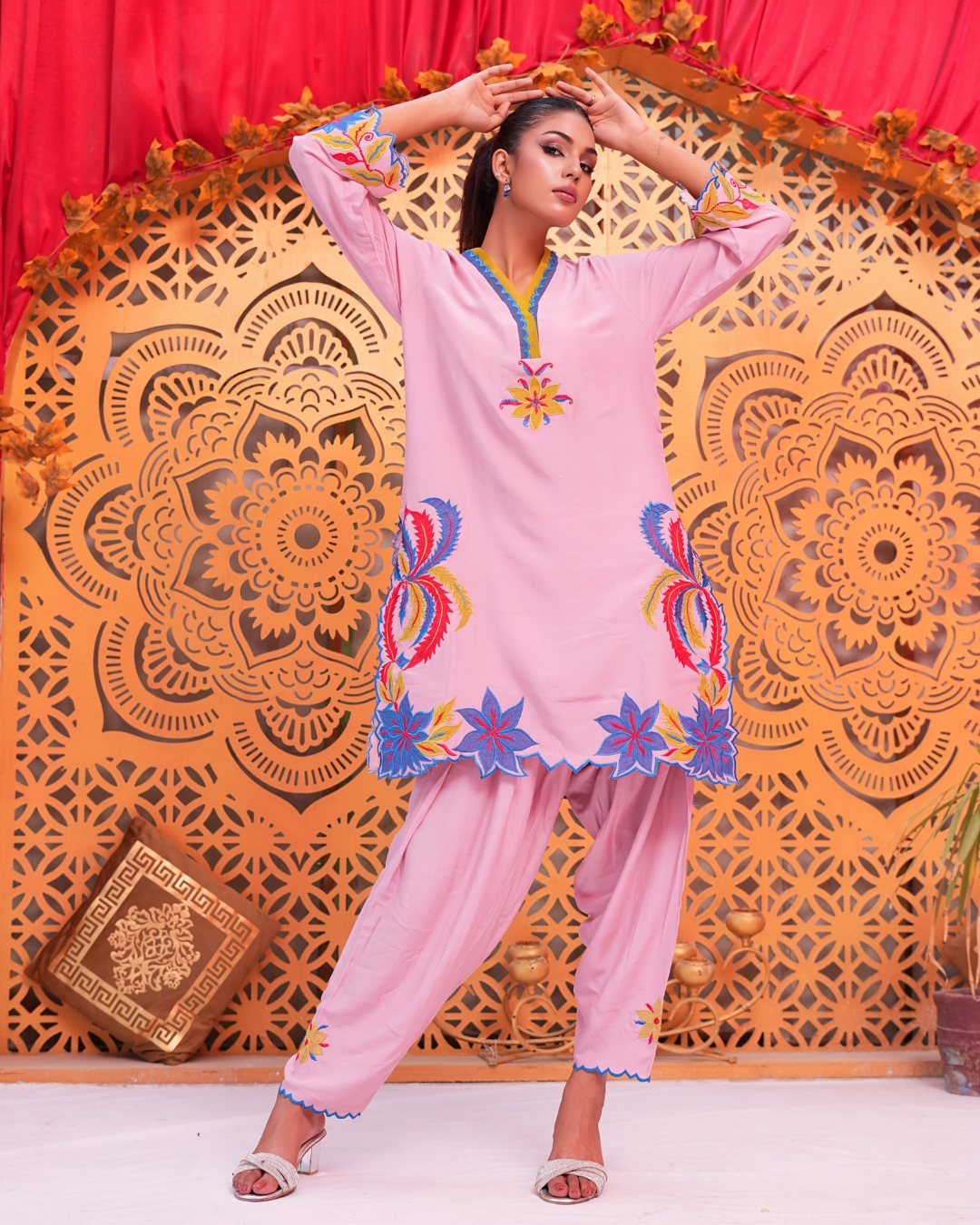 a beautifully designed two-piece ready-to-wear outfit crafted from soft viscose silk. The tea pink base is enhanced with intricate machine embroidery and delicate appliqué work in teal blue, neon, and deep red tones. Featuring a short-cut shirt paired with a matching shalwar, Arisha blends modern style with effortless comfort.