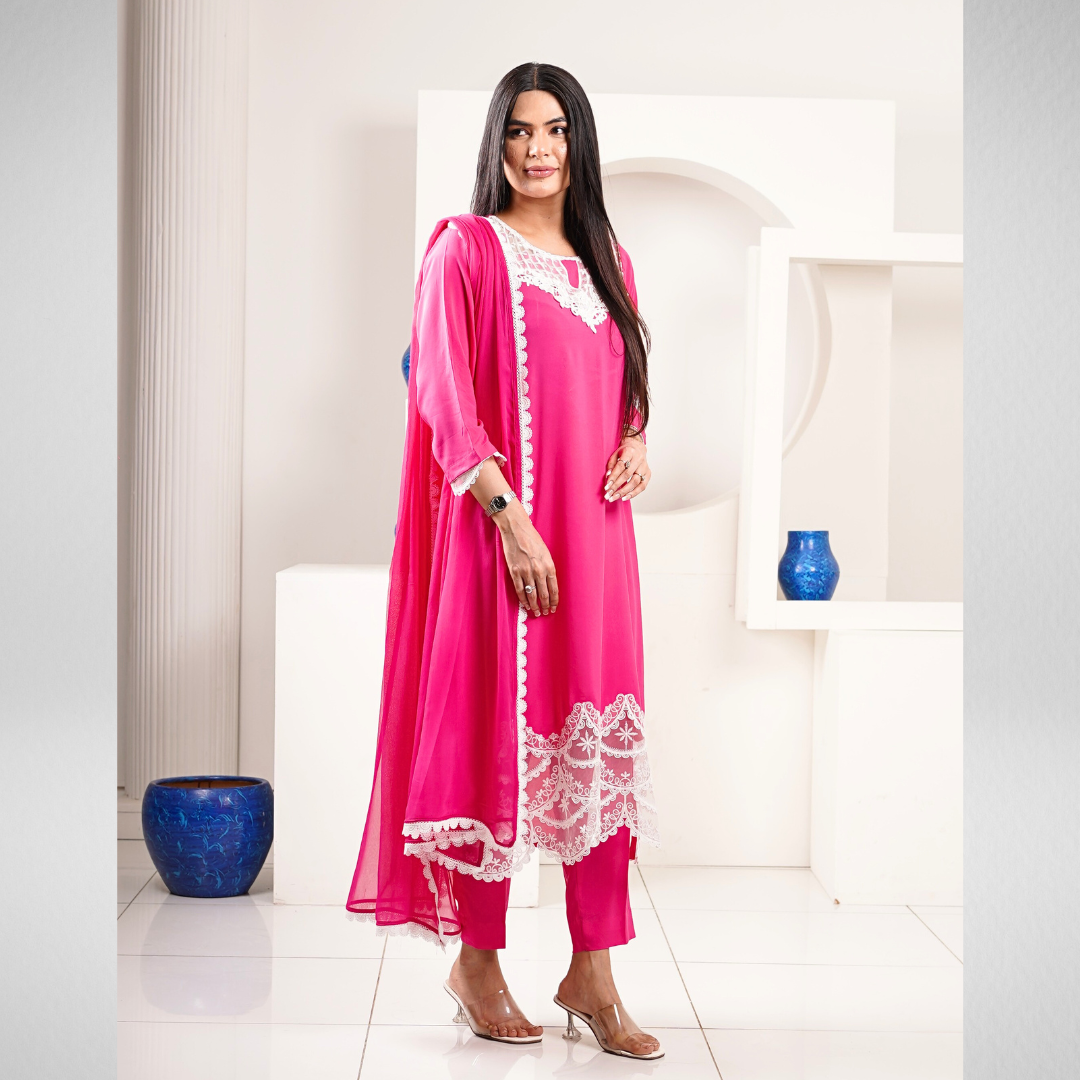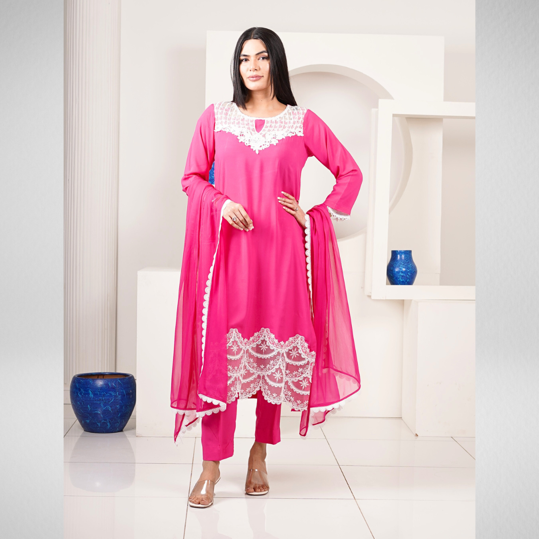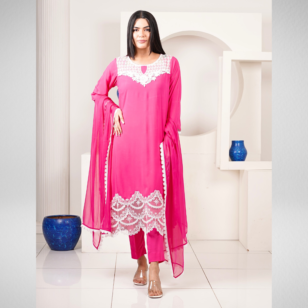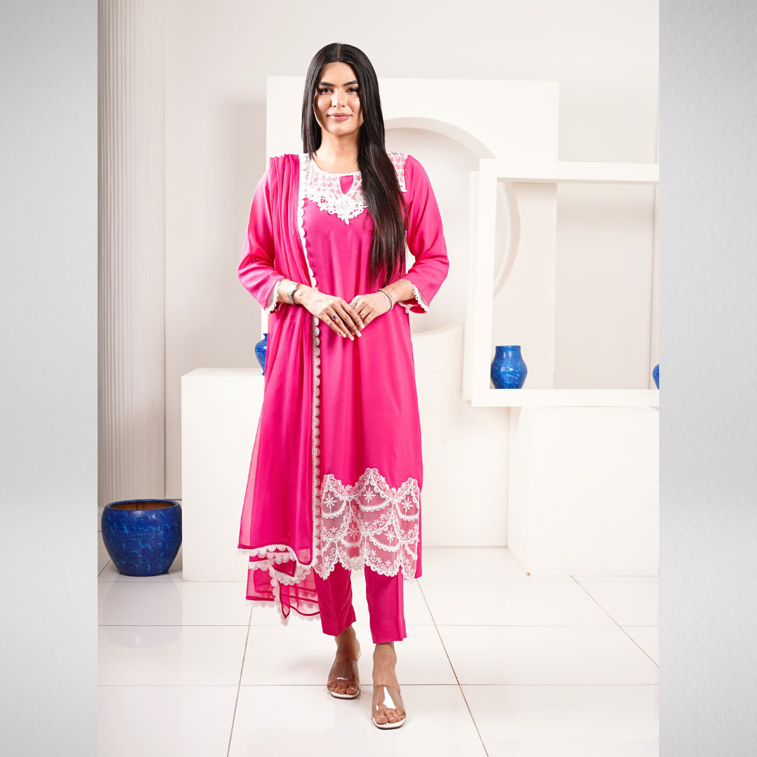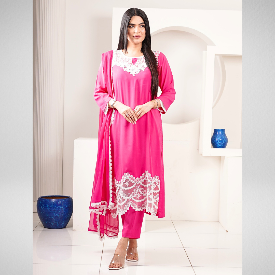 This 3-piece ready-to-wear rose pink outfit features intricate detailing on the neckline, sleeves, and daman, paired with a chiffon dupatta. Perfect for Eid, parties & casual glam!