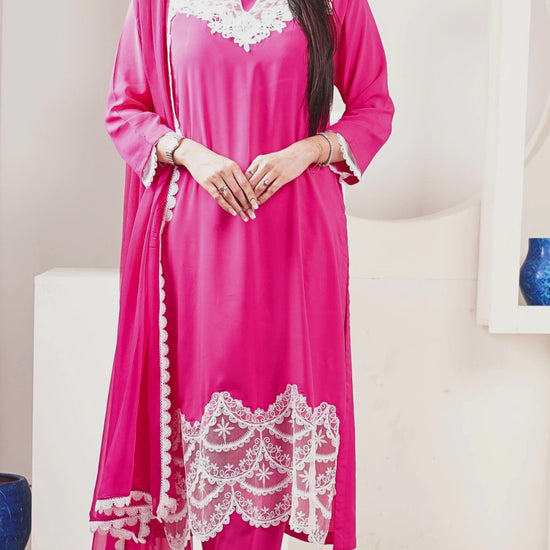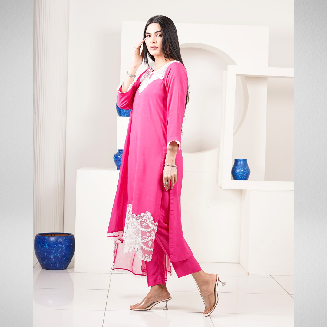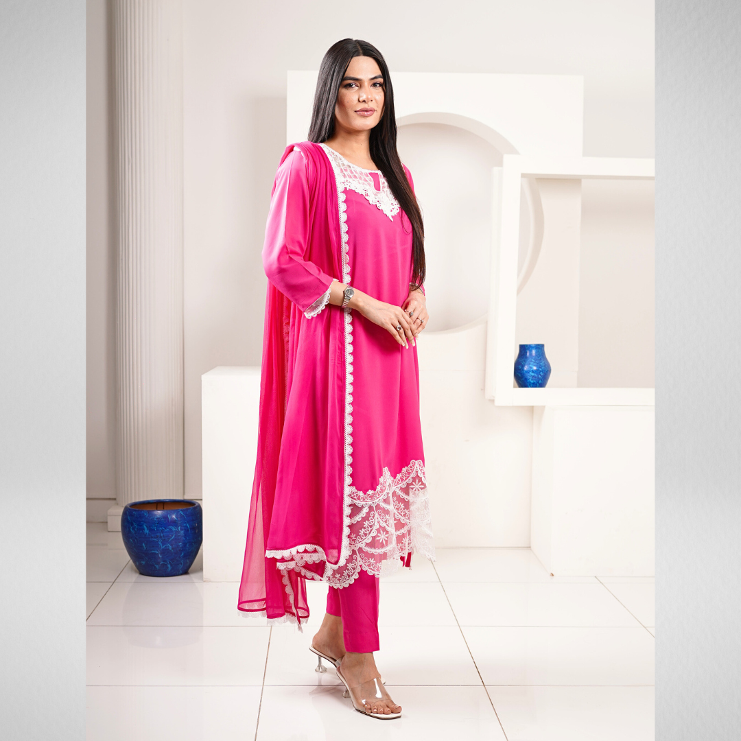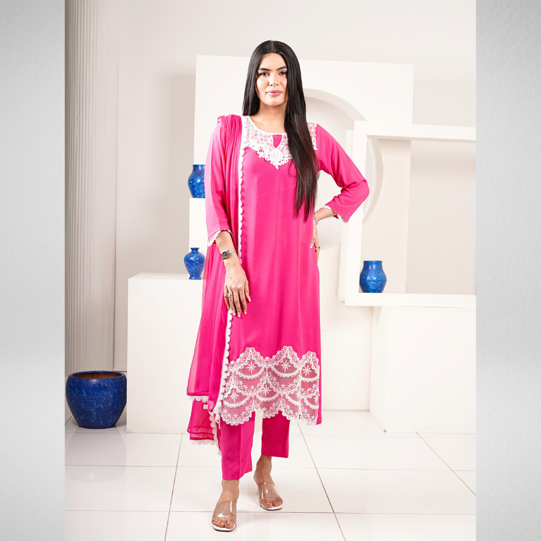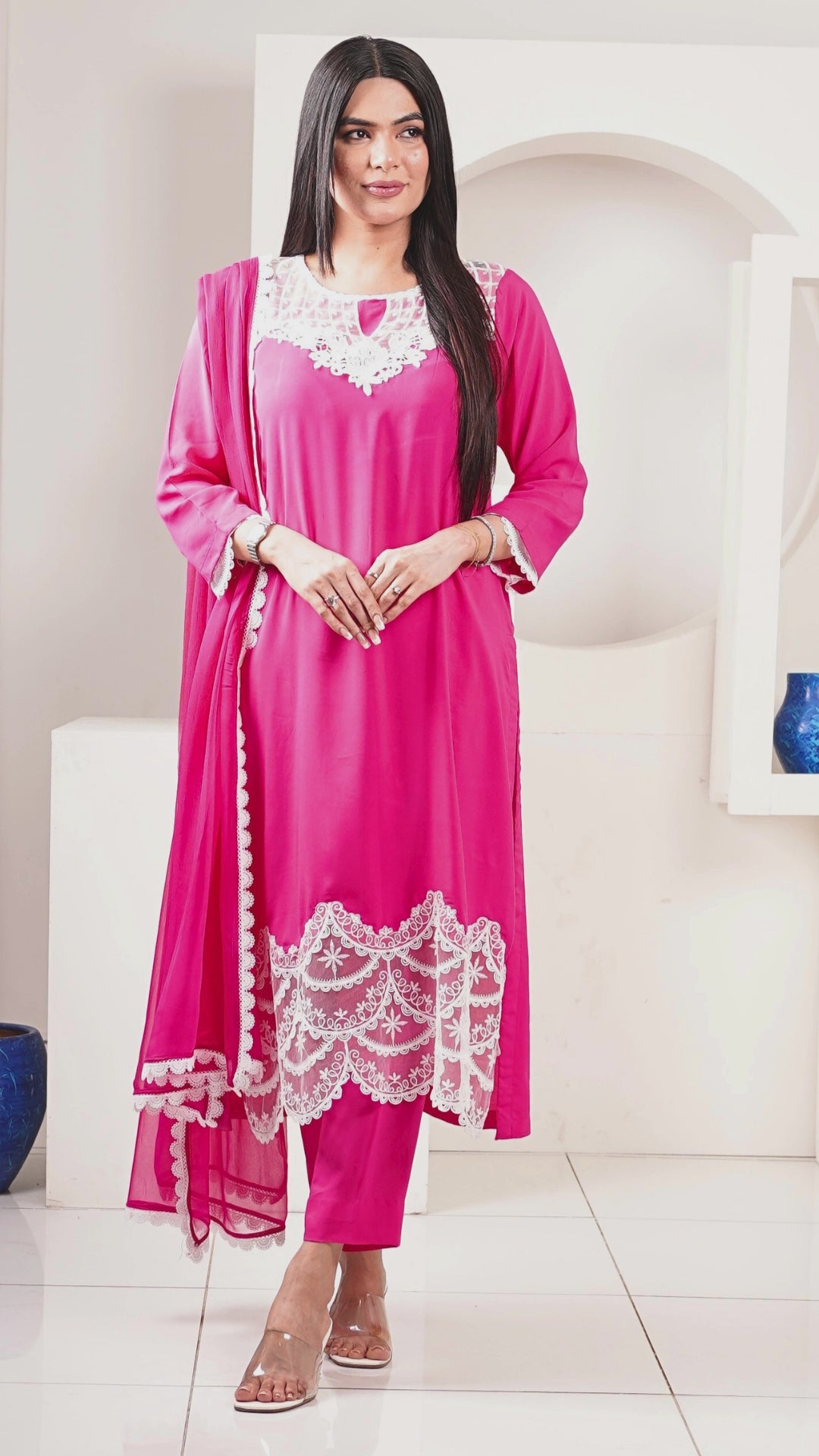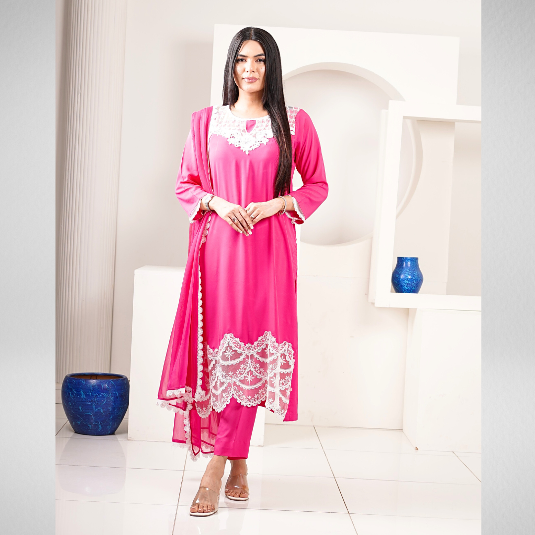 This 3-piece ready-to-wear rose pink outfit features intricate detailing on the neckline, sleeves, and daman, paired with a chiffon dupatta. Perfect for Eid, parties & casual glam!