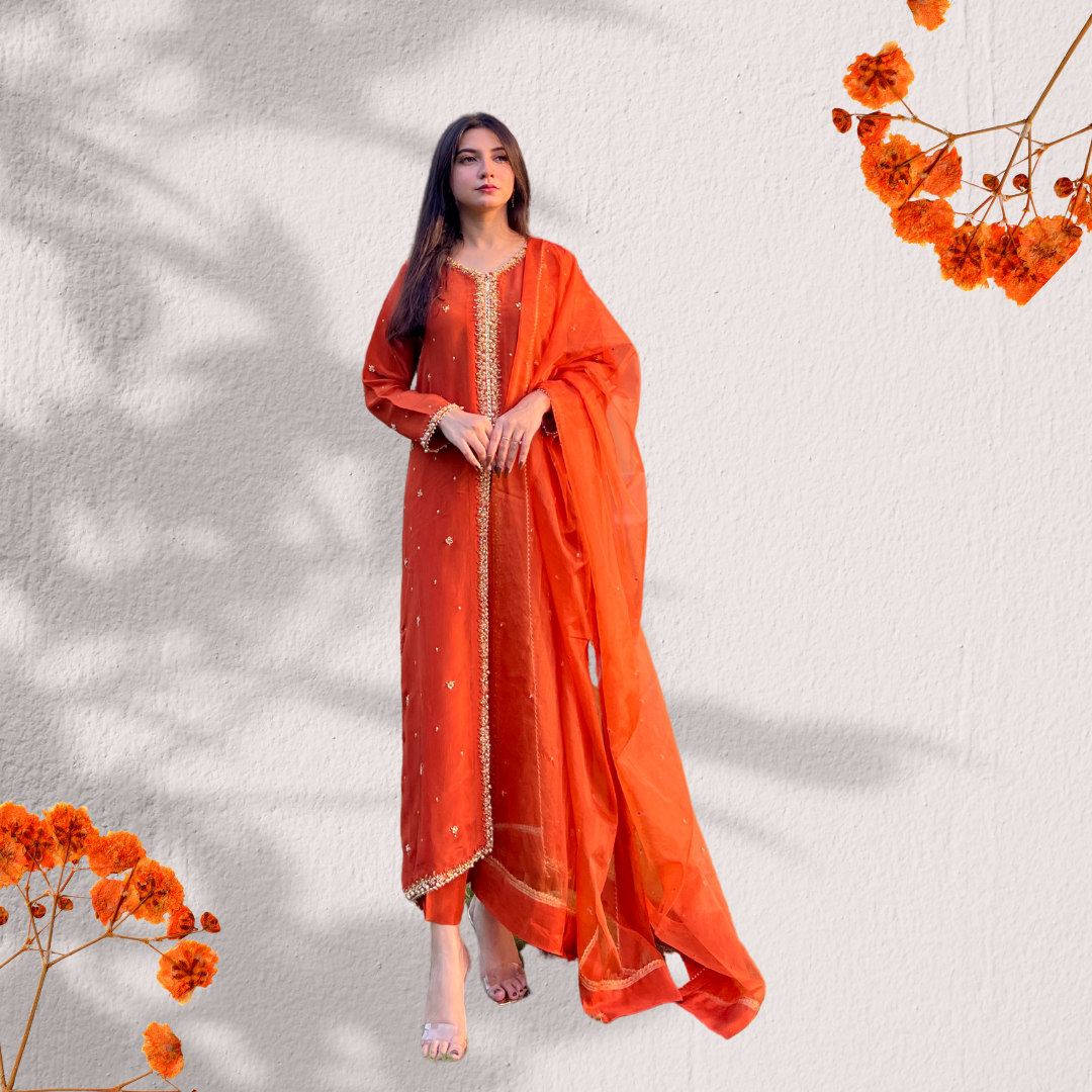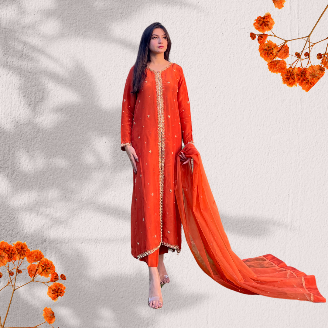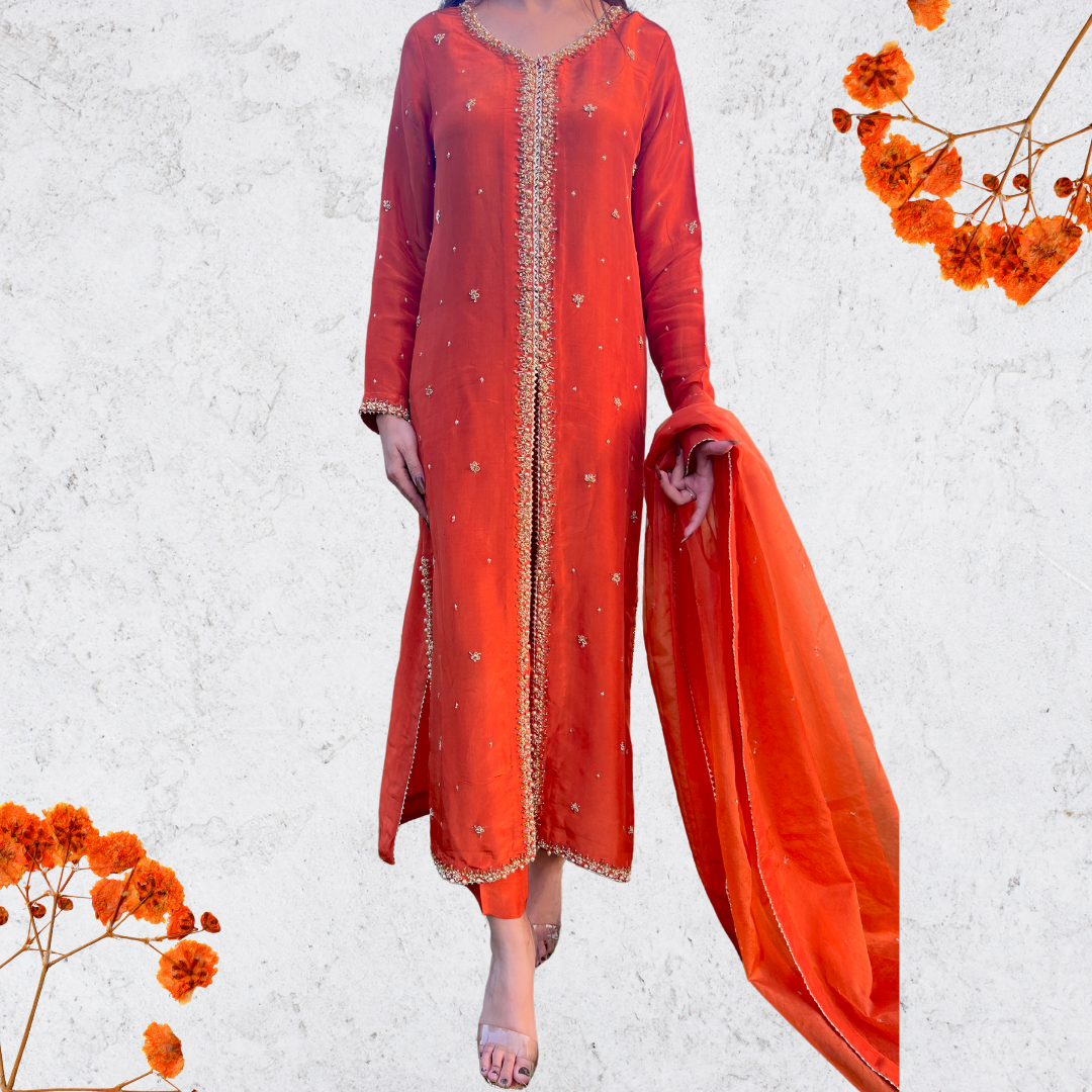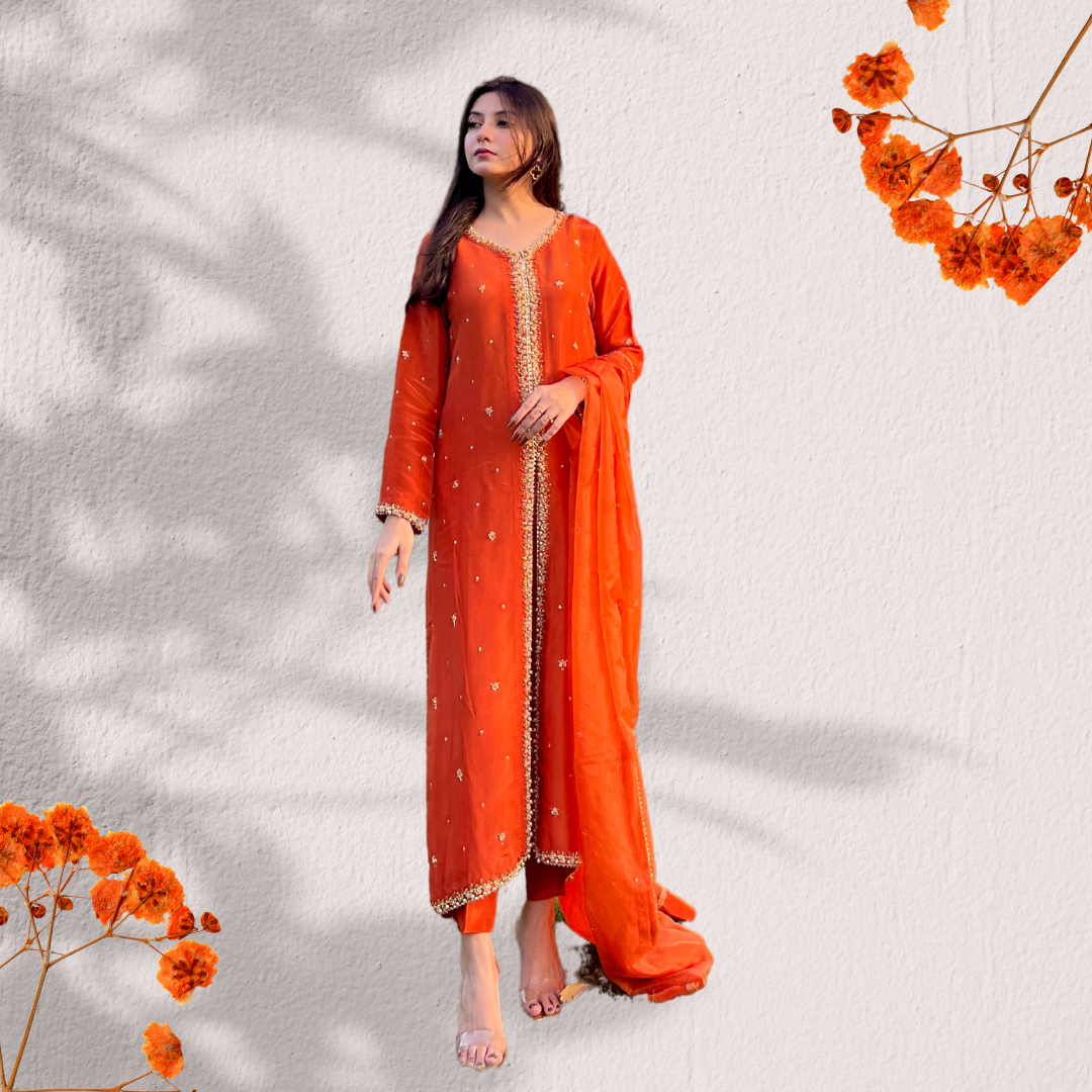 Elevate your elegance with Ishq: a luxurious and stunning embroidered raw silk ensemble featuring a front-open shirt adorned with intricate golden embroidery, paired with chic cigarette pants and a delicate organza dupatta finished with golden lace and chan details. Perfectly crafted for timeless sophistication, Ishq is the best choice for weddings, festive celebrations, or any formal occasion. Shop now to own this exquisite piece!