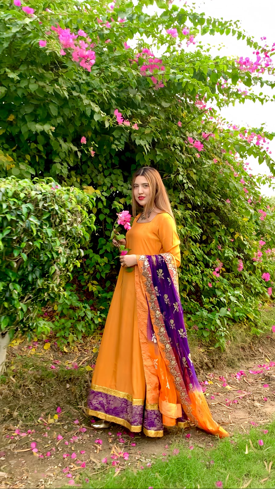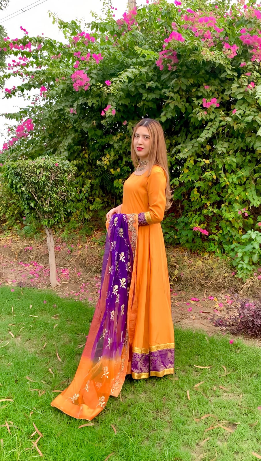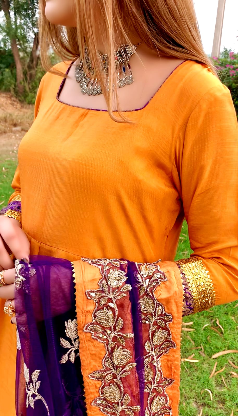 Elevate your elegance with Layla! This vibrant three-piece stitched pishwas in raw silk combines a rich orange hue with a striking purple contrast. Featuring intricate jamawar detailing, delicate lace accents, and a beautifully embroidered net dupatta finished with kinara lace, Layla is perfect for timeless charm and unforgettable style. 💫✨ Shop now and elevate your style!