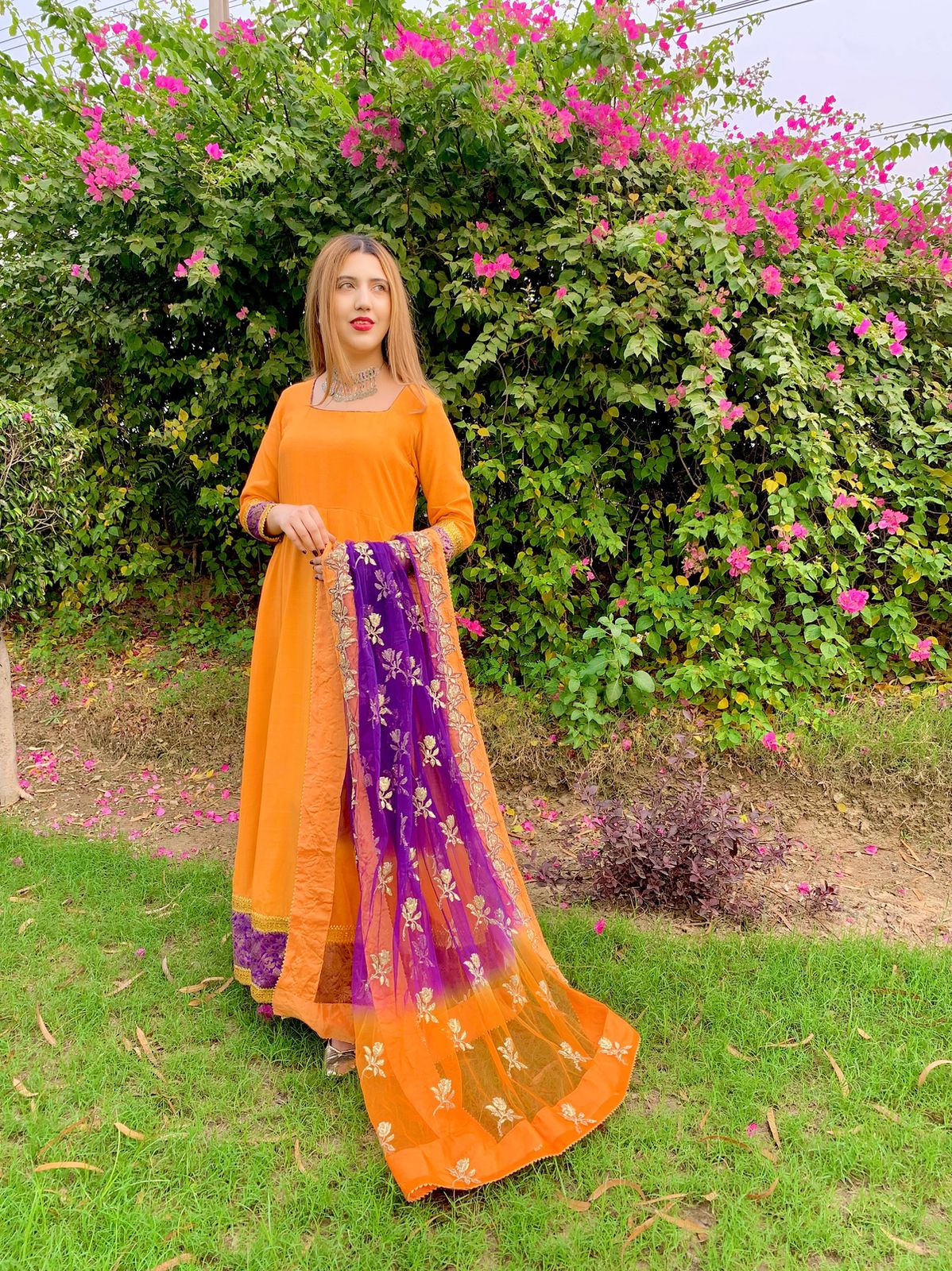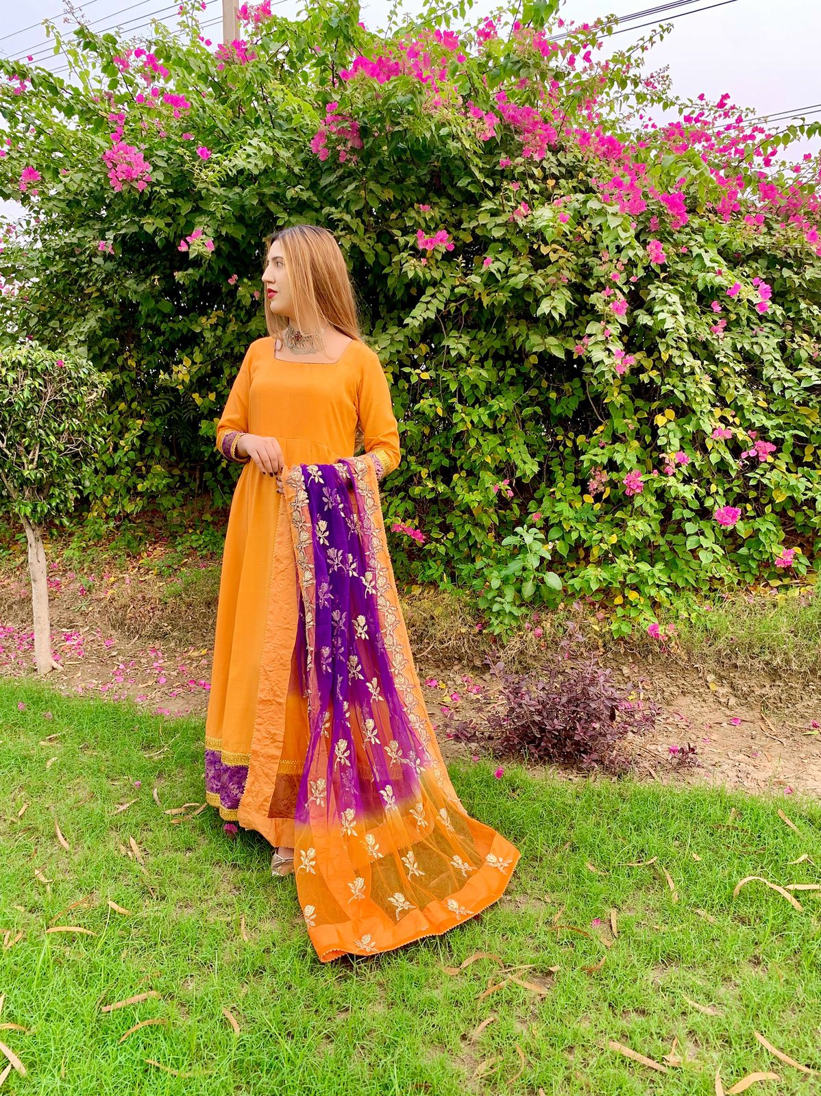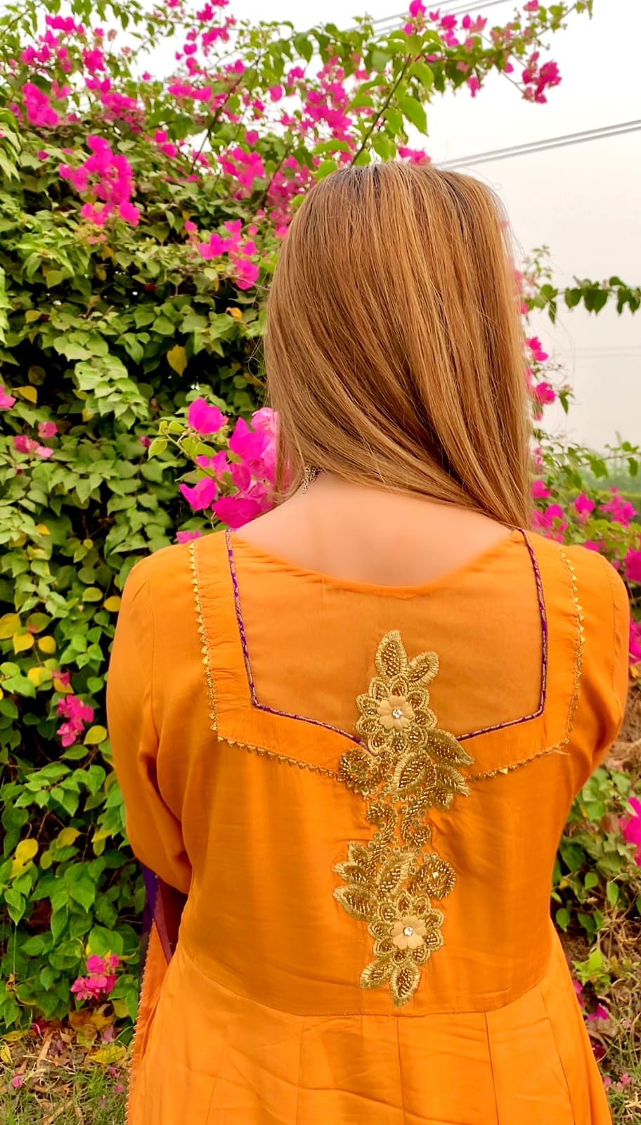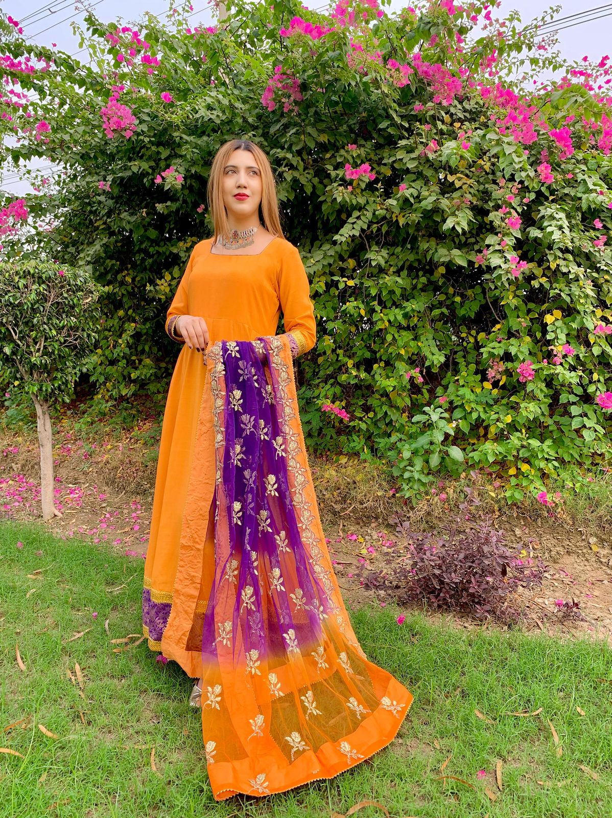 Elevate your elegance with Layla! This vibrant three-piece stitched pishwas in raw silk combines a rich orange hue with a striking purple contrast. Featuring intricate jamawar detailing, delicate lace accents, and a beautifully embroidered net dupatta finished with kinara lace, Layla is perfect for timeless charm and unforgettable style. 💫✨ Shop now and elevate your style!