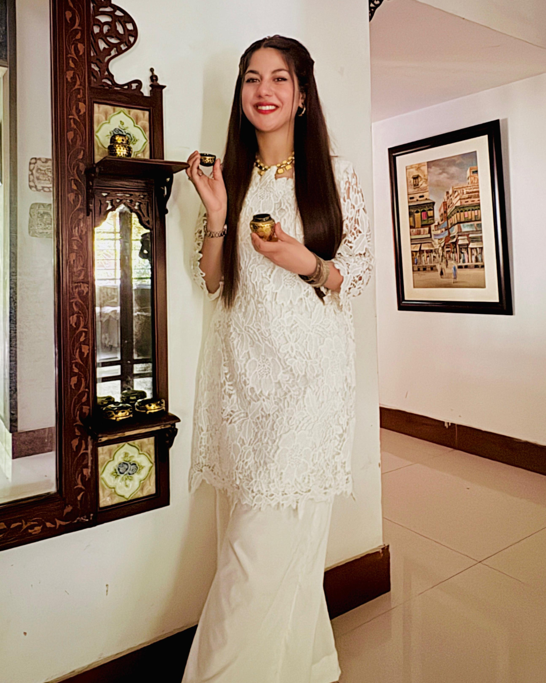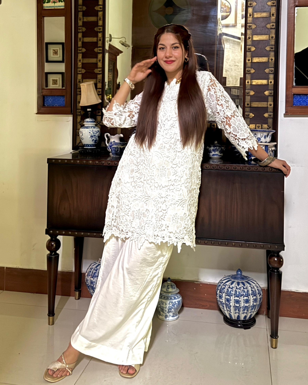 The gorgeous Areej Mohiuddin was spotted wearing our Lia — a luxurious white cutwork net co-ord set — on the shoot of her upcoming drama. She styled it with effortless grace, proving that elegance never goes out of style.