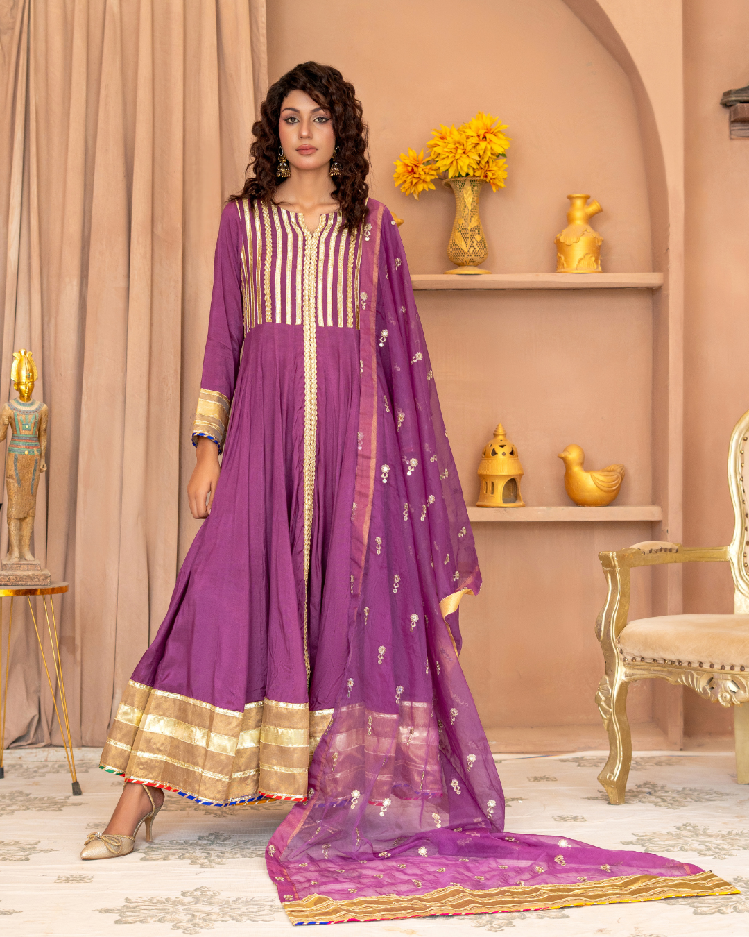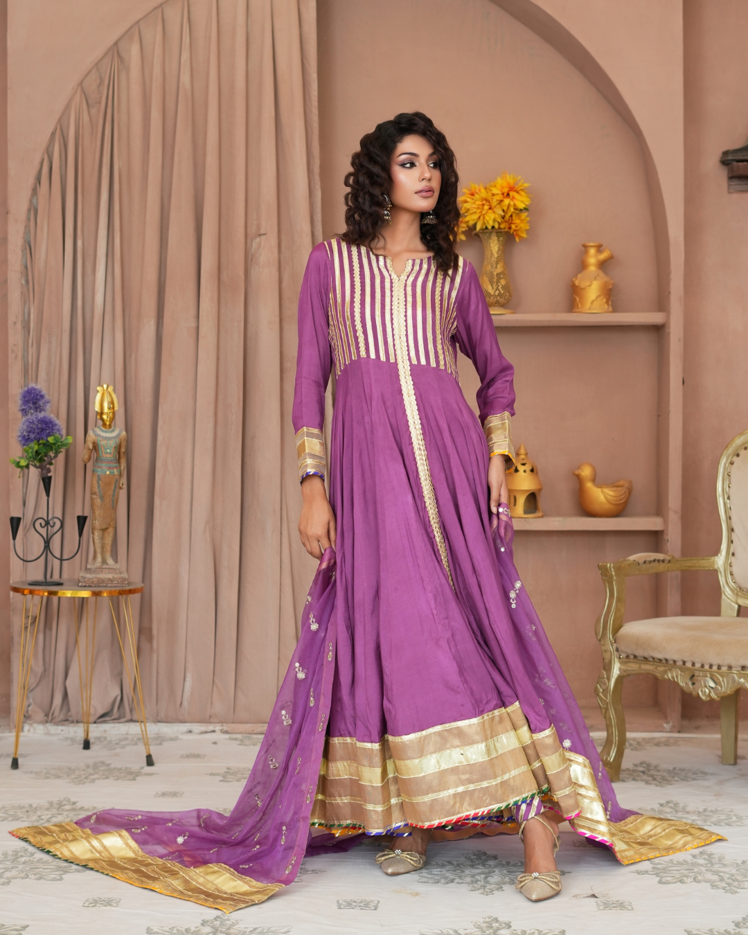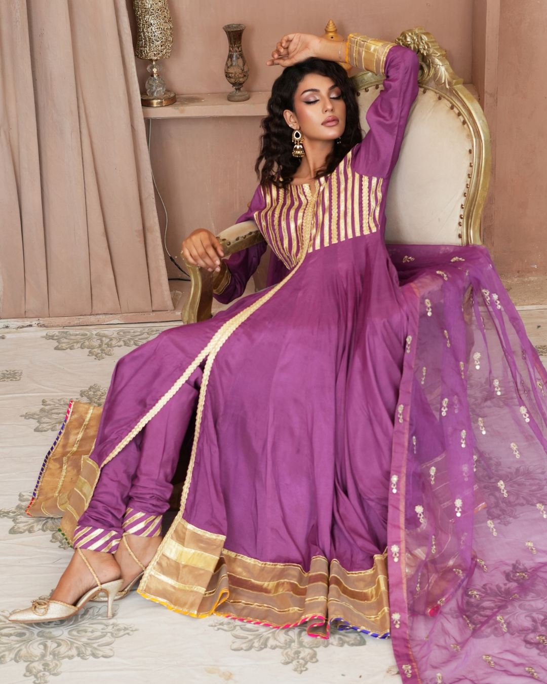 Introducing Mahgul, a luxurious kalidar pishwas crafted from cotton silk and paired with an embroidered organza dupatta, both adorned with delicate gotta detailing. Its front-open silhouette and classic churidar pajama beautifully blend traditional craftsmanship with contemporary sophistication—ideal for the festive season.