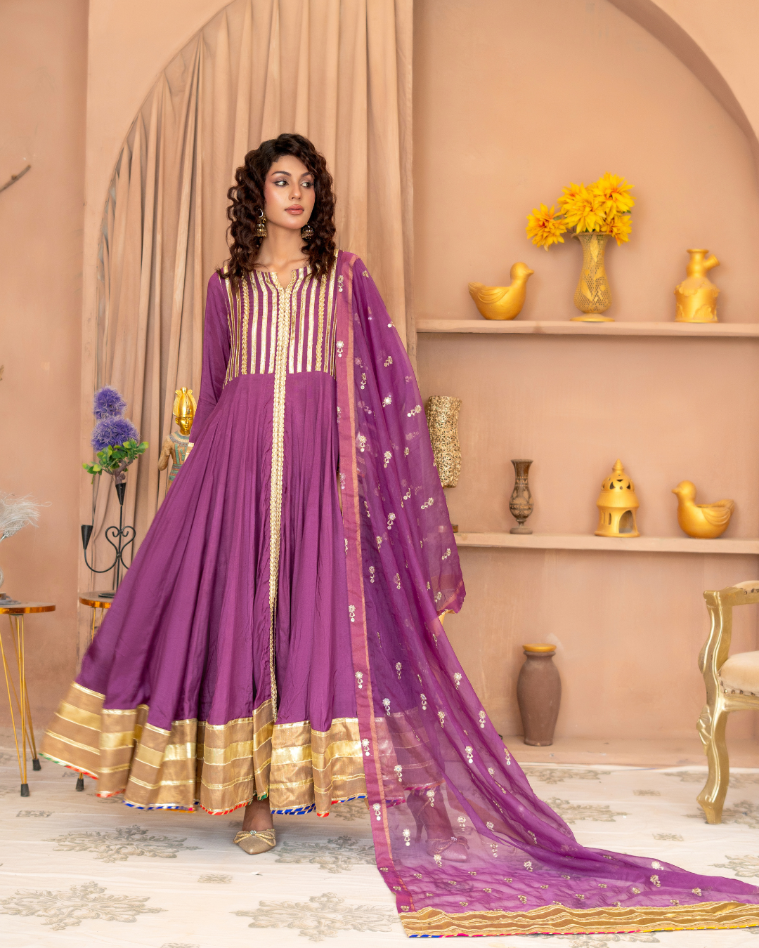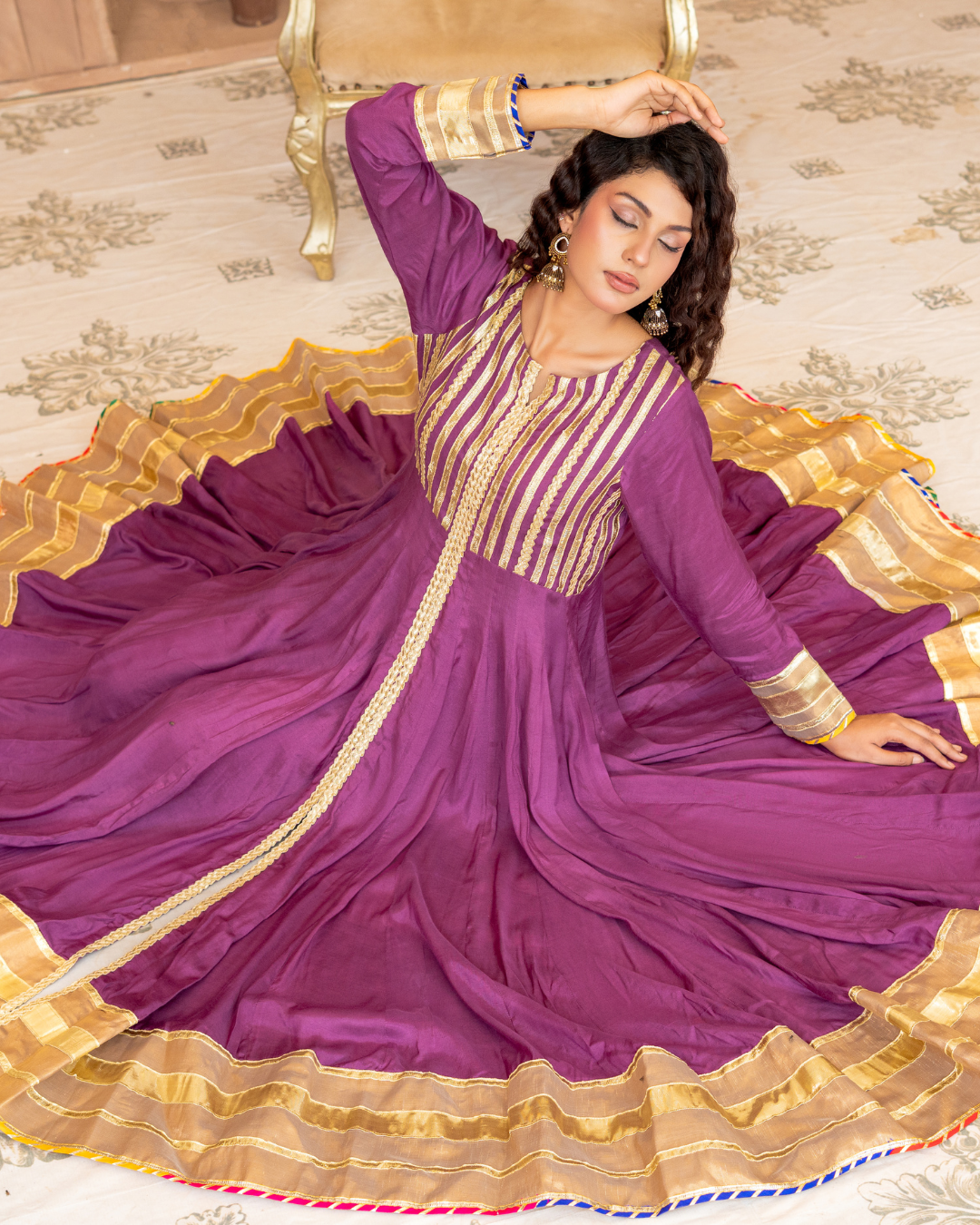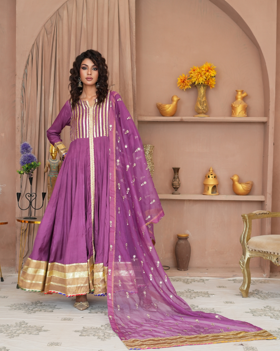 Introducing Mahgul, a luxurious kalidar pishwas crafted from cotton silk and paired with an embroidered organza dupatta, both adorned with delicate gotta detailing. Its front-open silhouette and classic churidar pajama beautifully blend traditional craftsmanship with contemporary sophistication—ideal for the festive season.