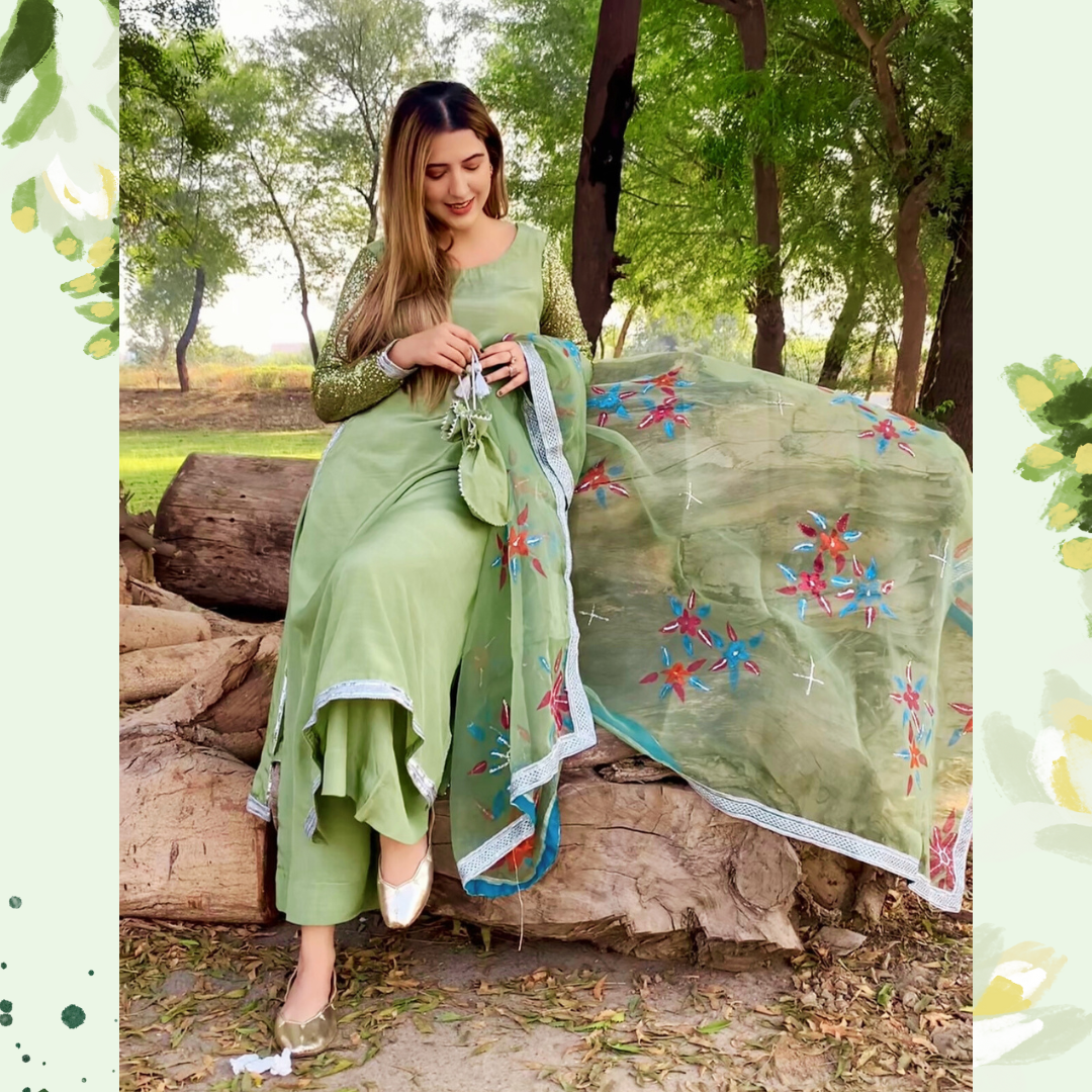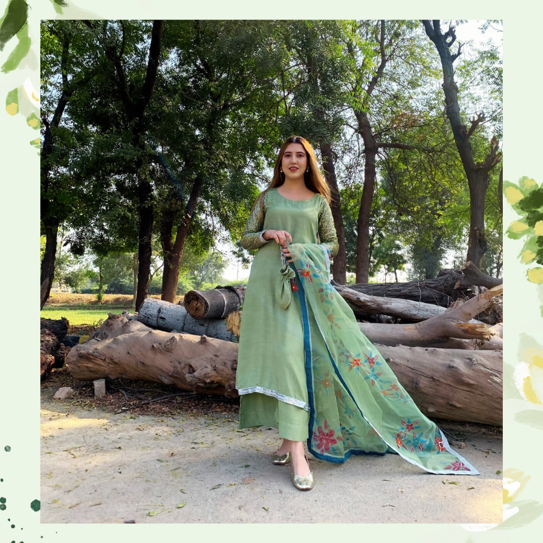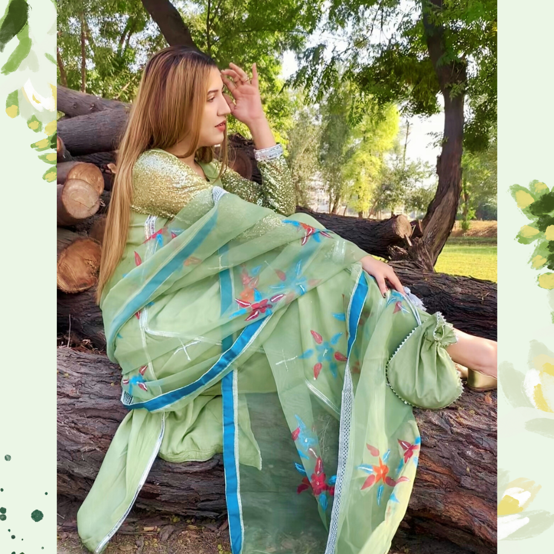 Elegance in every thread. Miraal is a 3-piece ready-to-wear masterpiece in raw silk, featuring exquisite silver lace detailing and sequined sleeves. Complete with a hand-painted organza dupatta, finished with delicate silver lace for that perfect touch of grace. A timeless addition to your wardrobe. ✨ Shop Now!