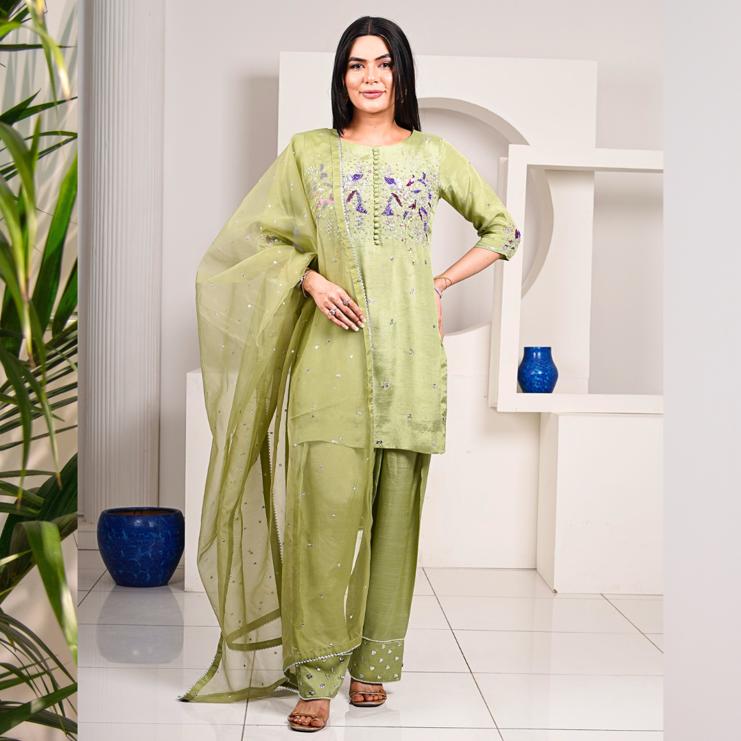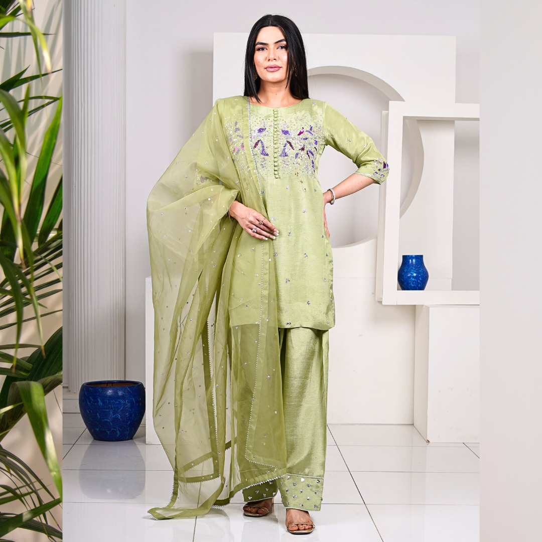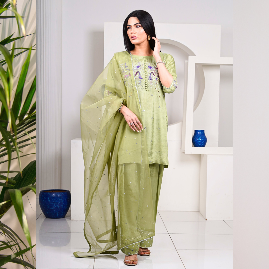 Make a statement in Noor, a stunning pistachio Farshi Shalwar set crafted in premium raw silk with delicate embellishments on the shirt and shalwar. Paired with a matching organza dupatta featuring intricate detailing, this ready-to-wear 3-piece ensemble is the perfect choice for Eid, festive celebrations, and weddings.