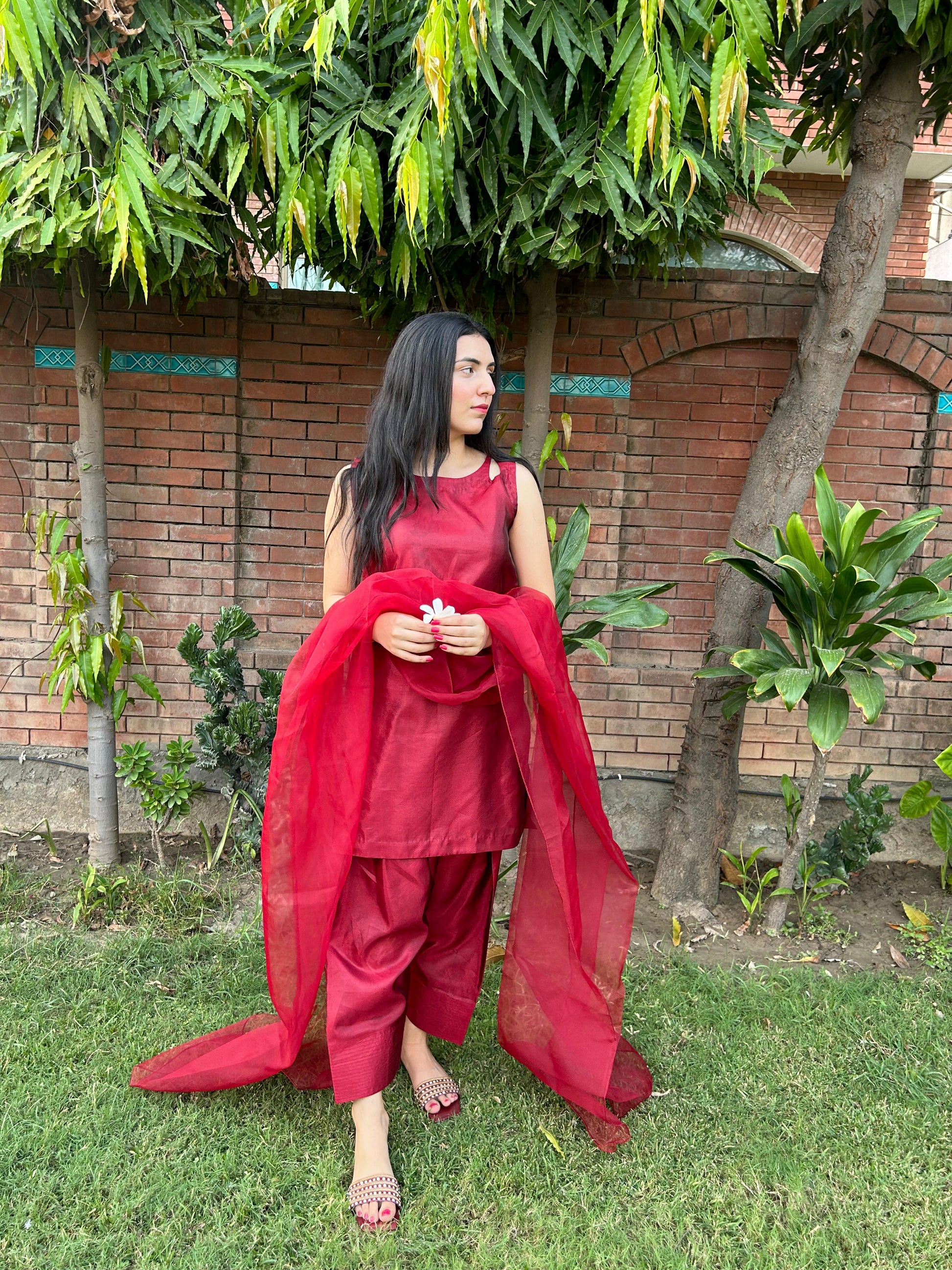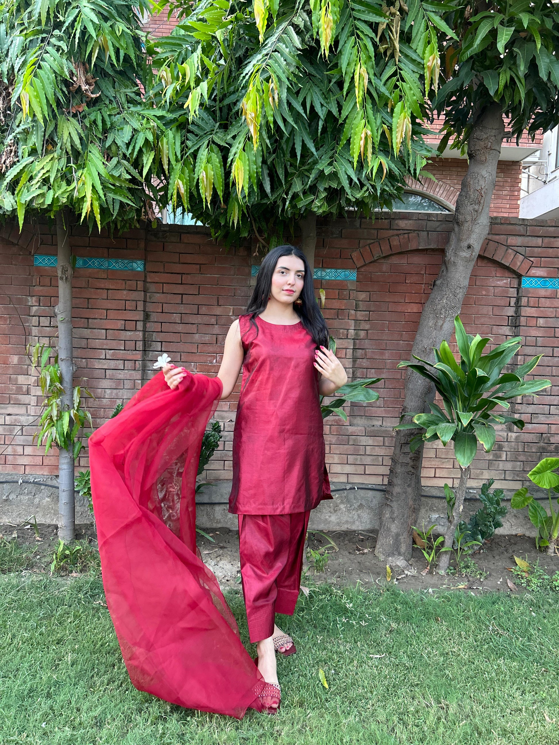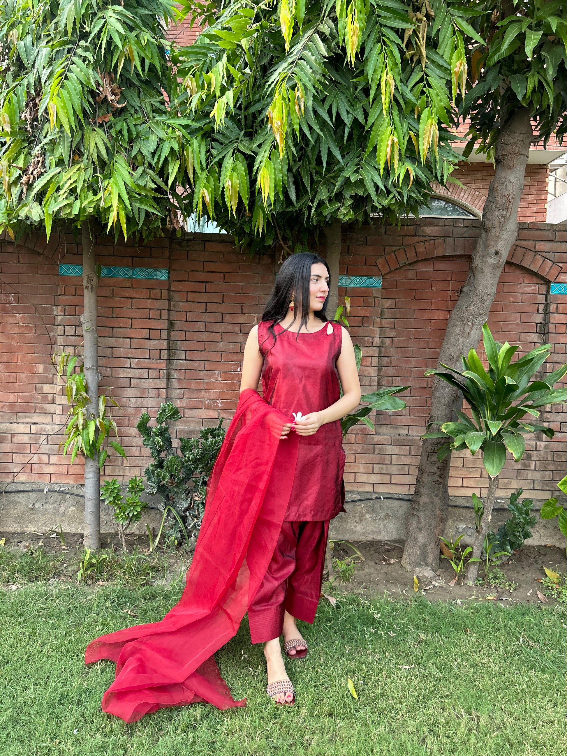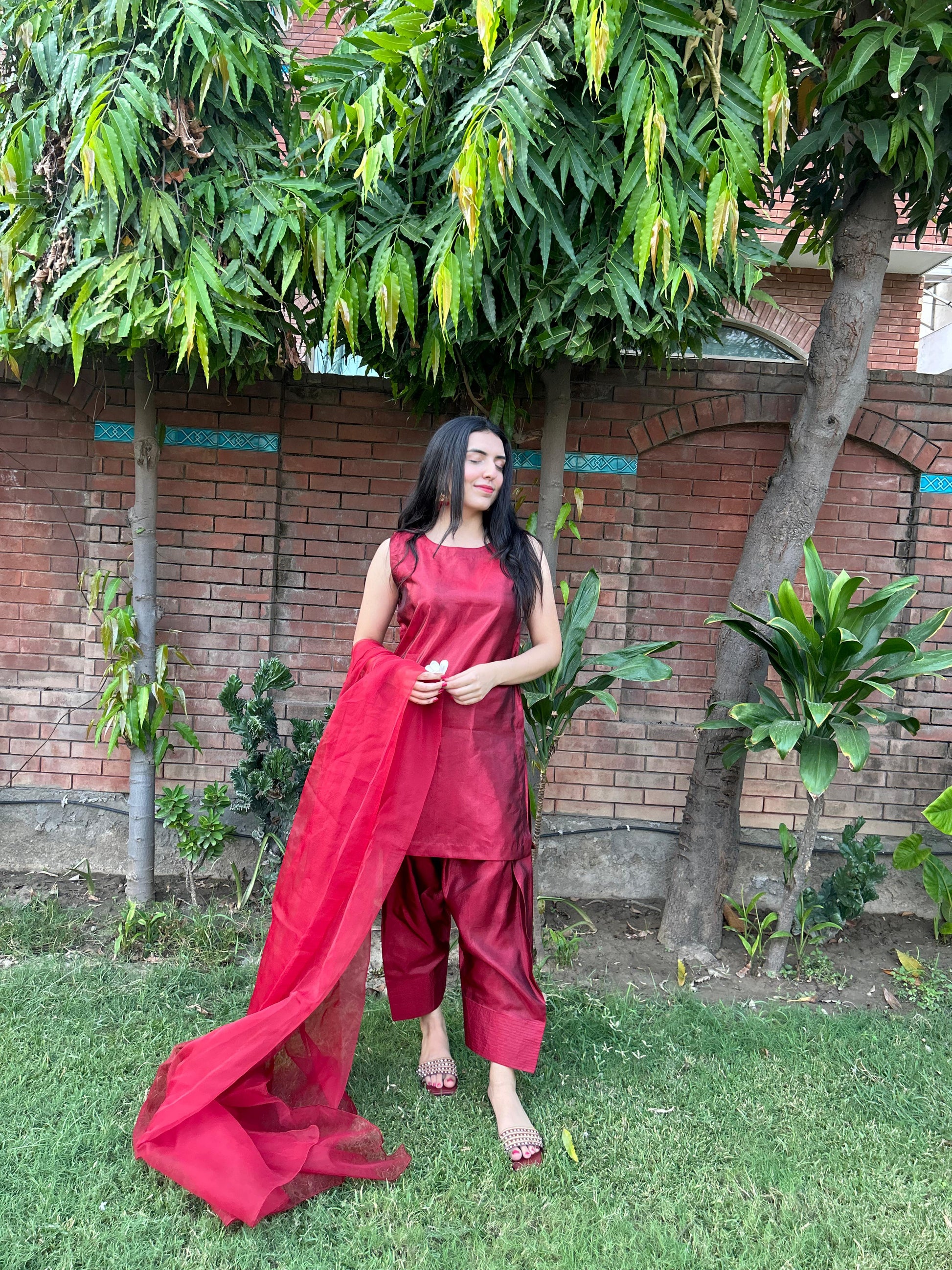 Elevate your style with the "Selene" dress in rich maroon silk. This sophisticated outfit features a chic short shirt paired with a traditional shalwar, creating a regal and elegant look perfect for any occasion. The ensemble is completed with a maroon organza dupatta that adds a touch of grace and refinement. Available with sleeves on demand, or in a sleeveless option, the "Selene" dress is designed to make a lasting impression at weddings, festive events, and special gatherings. Order now to exude timeless elegance!