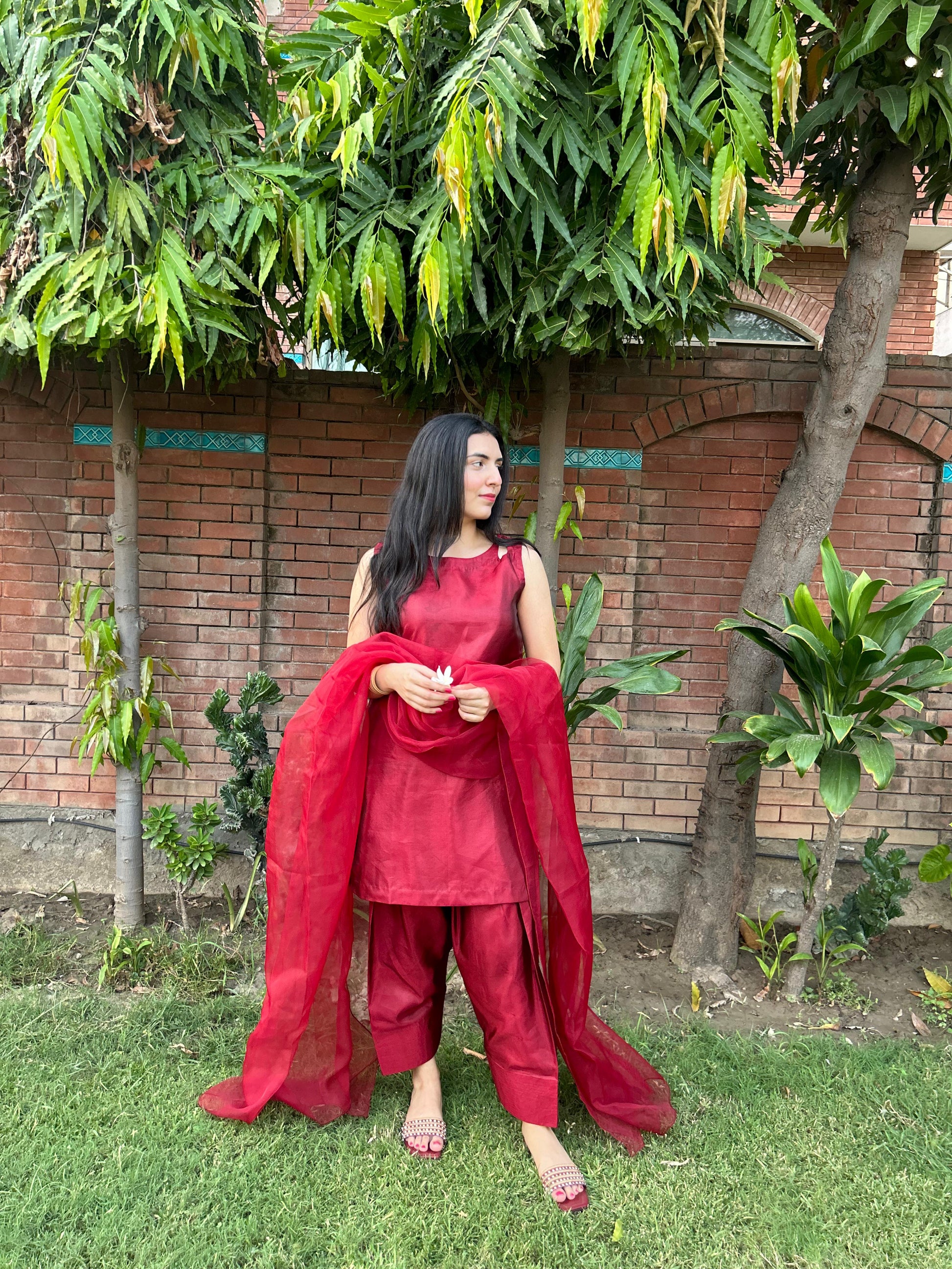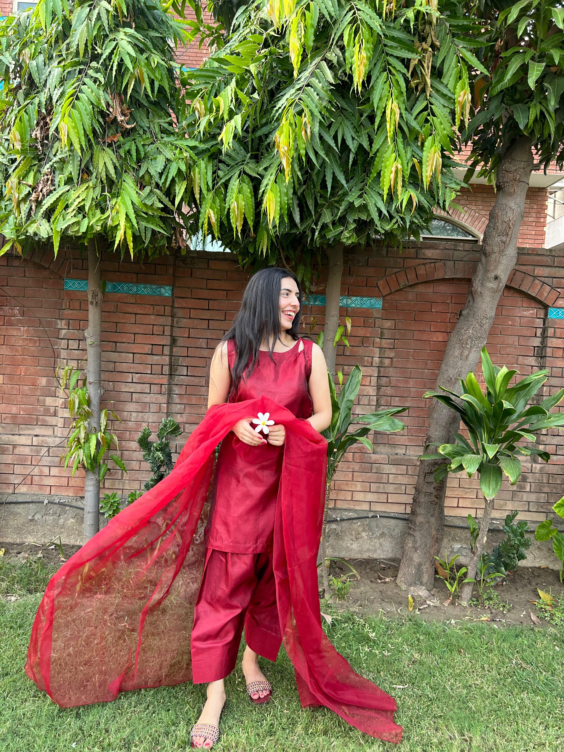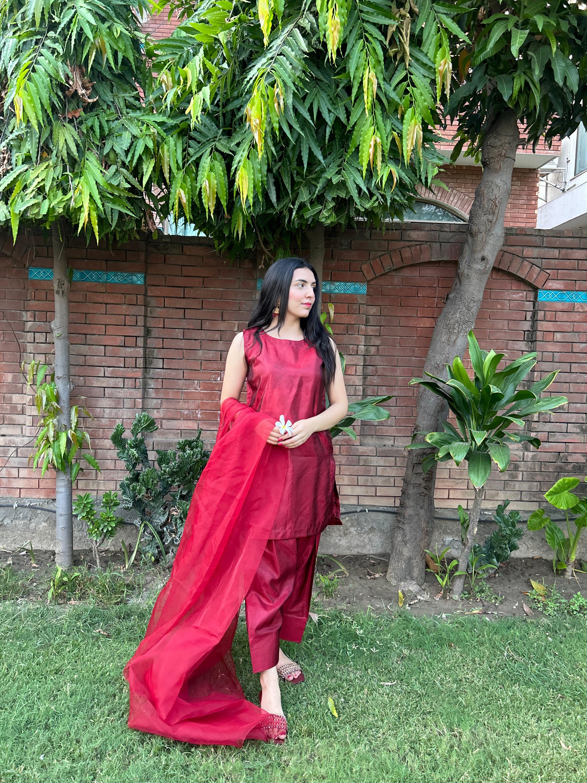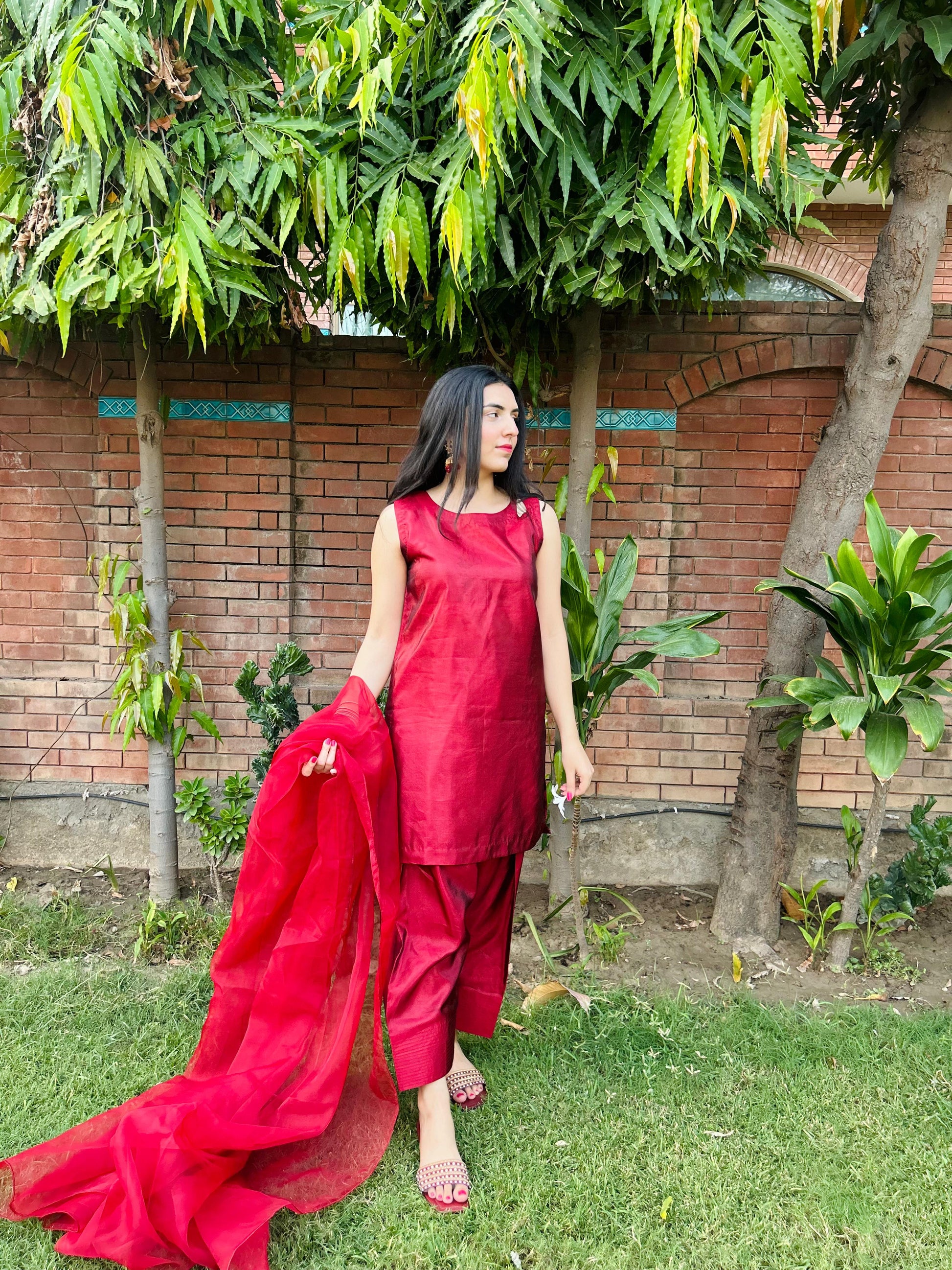 Elevate your style with the "Selene" dress in rich maroon silk. This sophisticated outfit features a chic short shirt paired with a traditional shalwar, creating a regal and elegant look perfect for any occasion. The ensemble is completed with a maroon organza dupatta that adds a touch of grace and refinement. Available with sleeves on demand, or in a sleeveless option, the "Selene" dress is designed to make a lasting impression at weddings, festive events, and special gatherings. Order now to exude timeless elegance!