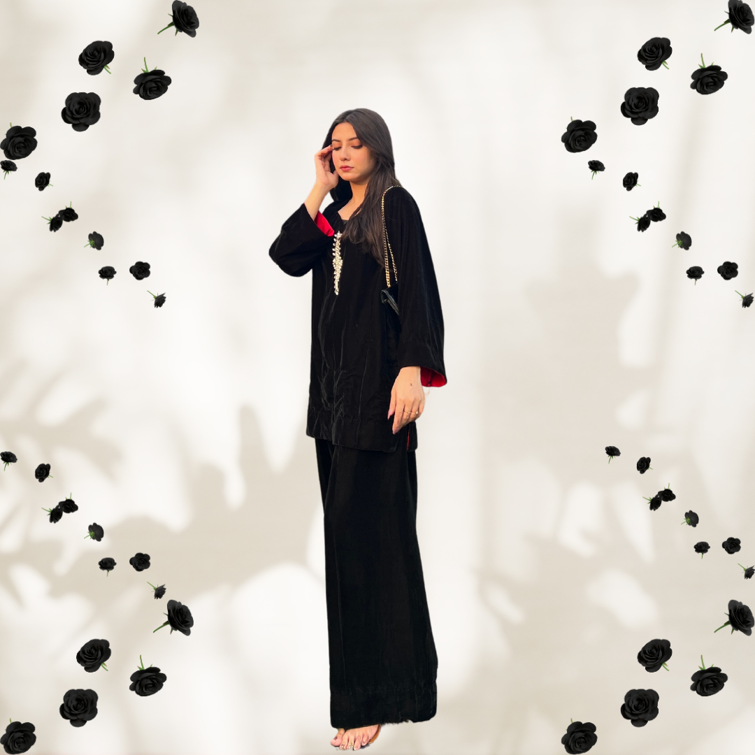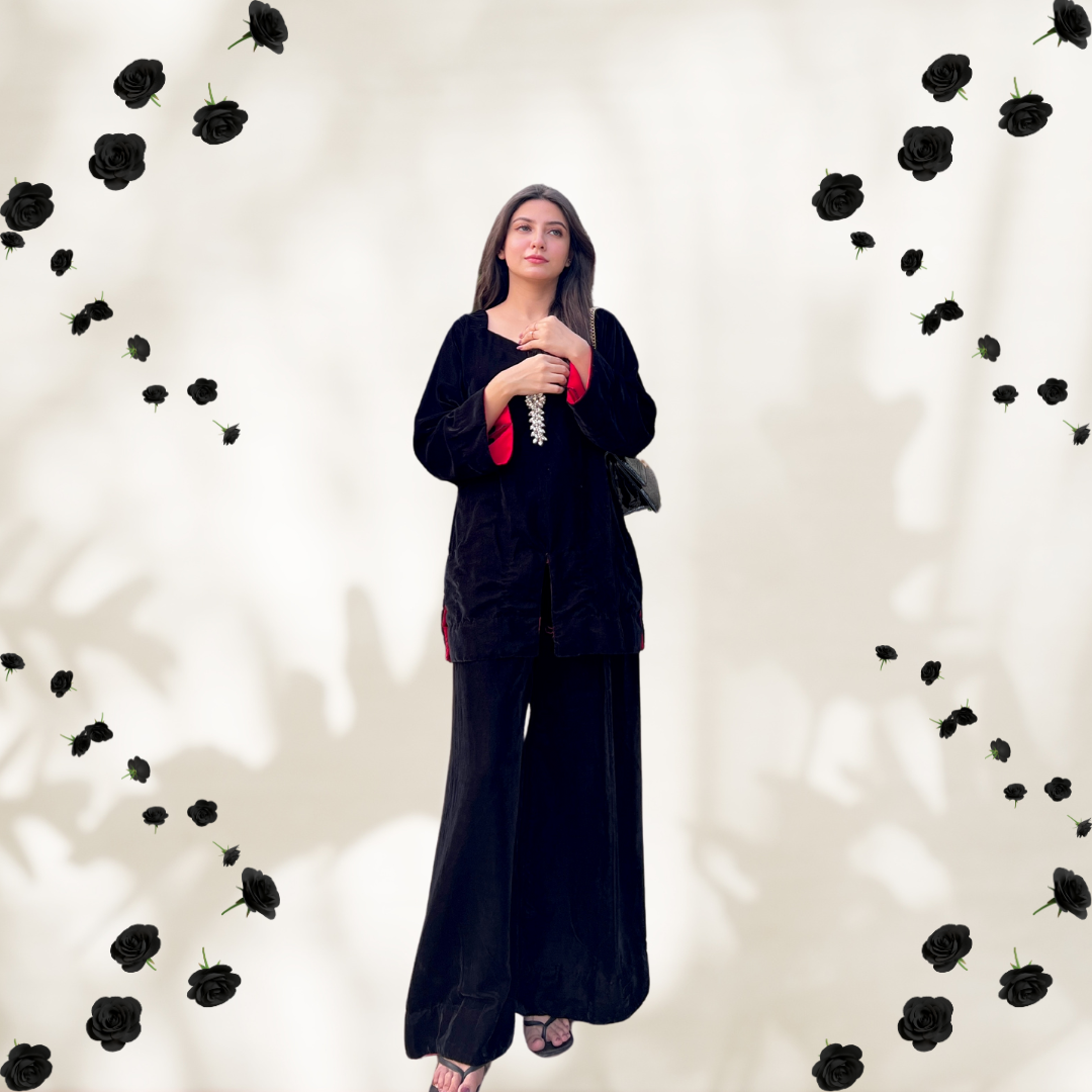 Turn heads with Zeba – a ready-to-wear black velvet co-ord set, elevated by a silver stone neckline. ✨ Don’t wait—shop now and own the spotlight!